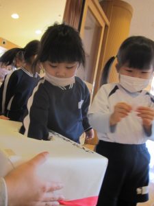 今日は、新年会がありました。獅子が登場し、みんなの健康と成長を祈ったり、みずき神社に初詣(お参り)したりしお正月の行事を楽しみました。昨年はドキドキした獅子舞に「頭噛んでもらったら頭良くなるし頑張るわ」と勇気を出して頭を噛んでもらう子もいました。先日、お正月のお節料理を給食でもいただきましたが、今日はお節料理の由来を聞いて「ほ~なんや~」と改めて頷く姿も・・・日本ならではの伝統行事に触れる良い一日となりました。