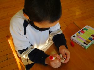 年長児ひまわり組では、コマ回しに夢中です。