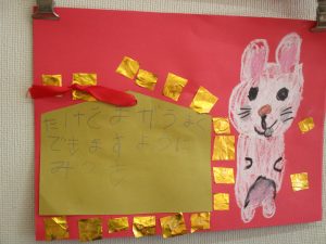 5歳児ひまわり組は絵馬に今年のお願い事をしたため、3歳児さくら組は折り紙で干支のウサギも作りました。今年のみずきっ子達も、可愛いうさぎさんのようにぴょんぴょんと飛躍していくことでしょう。楽しみですね。