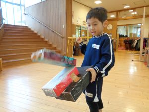 今朝は3歳児さくら組さんのお友だちが「みてみて!ぼくの獅子舞!!」と自分で一生懸命に色を塗って保育教諭や年上児に教えてもらいながら作った”ぼくの獅子舞”を得意になってみせてくれました。