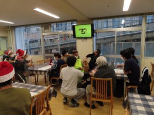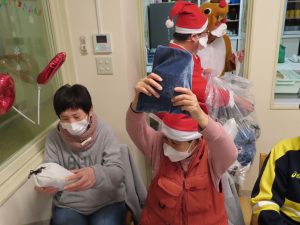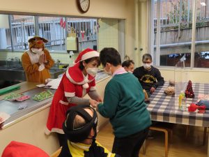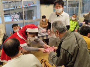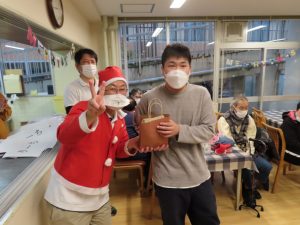 ビンゴ大会後、サンタに扮した施設長と副施設長から皆さんにお菓子を配り、ビンゴ大会上位者の方へ商品が進呈されました。