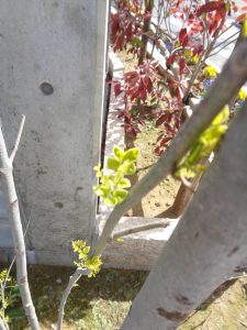 ”分園おひさまとかぜ”には、シンボルツリーの「ハナミズキ」と「シマトネリコ」が植栽されています。分園が開園するまでは、あまり元気の無い2本の木だったのですが、子ども達が元気に登園するようになるとこの2本の木にも新芽がつき、お花が咲きました。子ども達の元気な声や笑顔が栄養になったのですね。子ども達の可愛い笑顔は最高です。