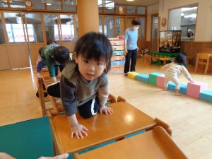 大好きな虫探しをお友だちや先生と楽しんだり、オープンスペースではちょっぴり難しい高さのある巧技台にもチャレンジ。沢山体を動かします。