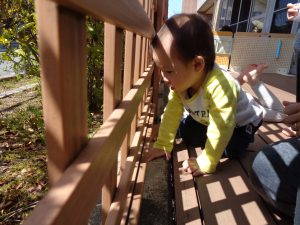 大好きな虫探しをお友だちや先生と楽しんだり、オープンスペースではちょっぴり難しい高さのある巧技台にもチャレンジ。沢山体を動かします。