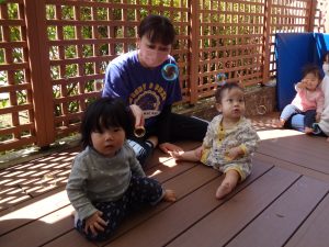 今日はもも組のお友だちはテラスでぽかぽかひなたぼっこをしましたよ。