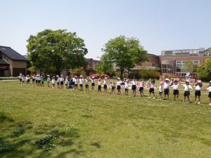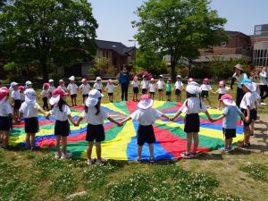 初めての戸外でのパラバルーンは風の強さや足元がいつもと違い「いつもみたいにならん」と困った事もあったようですが「どうしてかな」「どうしたら膨らむかな」と友だちや保育教諭と一緒に考えながら取り組んでいました。