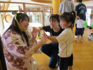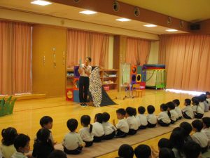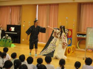 先生たちの劇では織姫と彦星が登場すると「うわぁ!」「○先生や!」「可愛い…」とキラキラした瞳で見ていました。でも二人が遊んでばかりで牛も元気がなくなり、機織り機も蜘蛛の巣だらけになってしまいました。その様子を見ていた天の神様が登場すると「神様怒ってる!」と息をのんで心配していました。一生懸命働いて、最後、天の川を渡って織姫と彦星が出会うとホッとした表情で「よかったね!」と笑顔になっていましたよ。