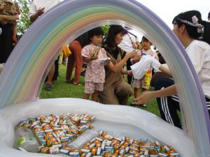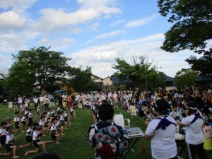 子ども達の願いが届き、当日は天候の心配が要らない大きな晴れマークでした。日中は、暑い中地域の方や、保護者のお父さん方もお手伝いに来てくださり、準備もスムーズに行う事ができました。