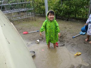 今日の天気は雨が降ったり止んだり…でも子ども達はそれが楽しくて、雨が降ると‶あめあつめ″雨が止むと泥んこ遊びと大忙しで遊びを楽しんでいました。