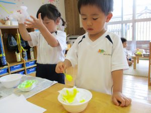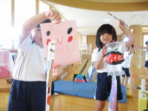 先日、夕涼み会で縁日を経験した子ども達。かき氷屋さんやアイスクリーム屋さんと手作りのお店屋さんが子ども達のアイディアで次々と開店しました。