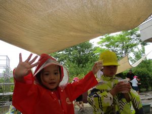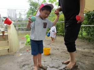 今日の天気は雨が降ったり止んだり…でも子ども達はそれが楽しくて、雨が降ると‶あめあつめ″雨が止むと泥んこ遊びと大忙しで遊びを楽しんでいました。