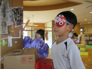招待状を出していたお化け屋敷には、2歳児たんぽぽ組が遊びに来て、おばけの滑り台やトンネルなど”おばけ迷路”を楽しみました。