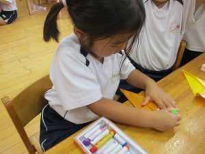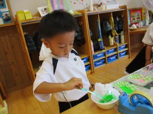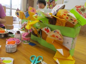 先日、夕涼み会で縁日を経験した子ども達。かき氷屋さんやアイスクリーム屋さんと手作りのお店屋さんが子ども達のアイディアで次々と開店しました。
