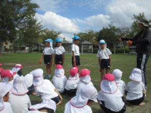 ひまわり組に鳴子を持った踊りを教えてもらいました。