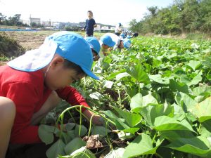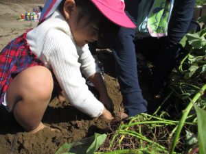 「そ~っと掘るんだよね」「お芋は爪があたると傷がついちゃうんだよ」と保育教諭と最初に確認しながら掘り始めました。自分達のお芋が折れちゃわないようにそっと掘り進める表情は真剣そのもの!