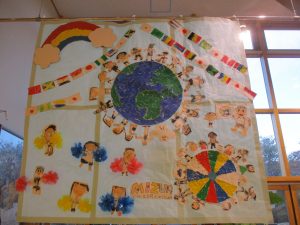 今日は園に、展示された大きな自分達の絵を子ども達もじっと見つめ「あれ、皆で作ったよね」「ぼく、ここ作ったよ」とお話していましたよ。