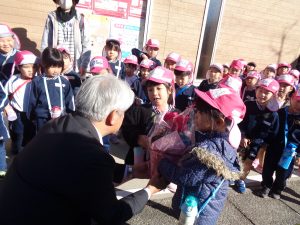 身近にお仕事をしてくれているお家の人はもちろん。園の周りでも自分達の為に、そしてみんなの為にお仕事してくれている人に「ありがとう」の気持ちを伝えにいくことになりました。