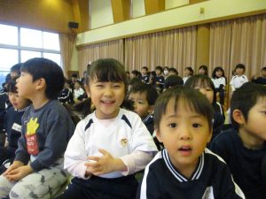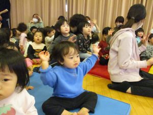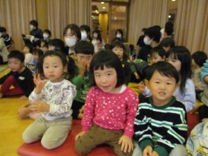 0~5歳児みんなで参加しました。小さなクラスのお友だちも音楽に合わせて自然と体が揺れていました。みんなの心をひとつにし、こんなに温かい気持ちにする音楽の力はすごいですね。