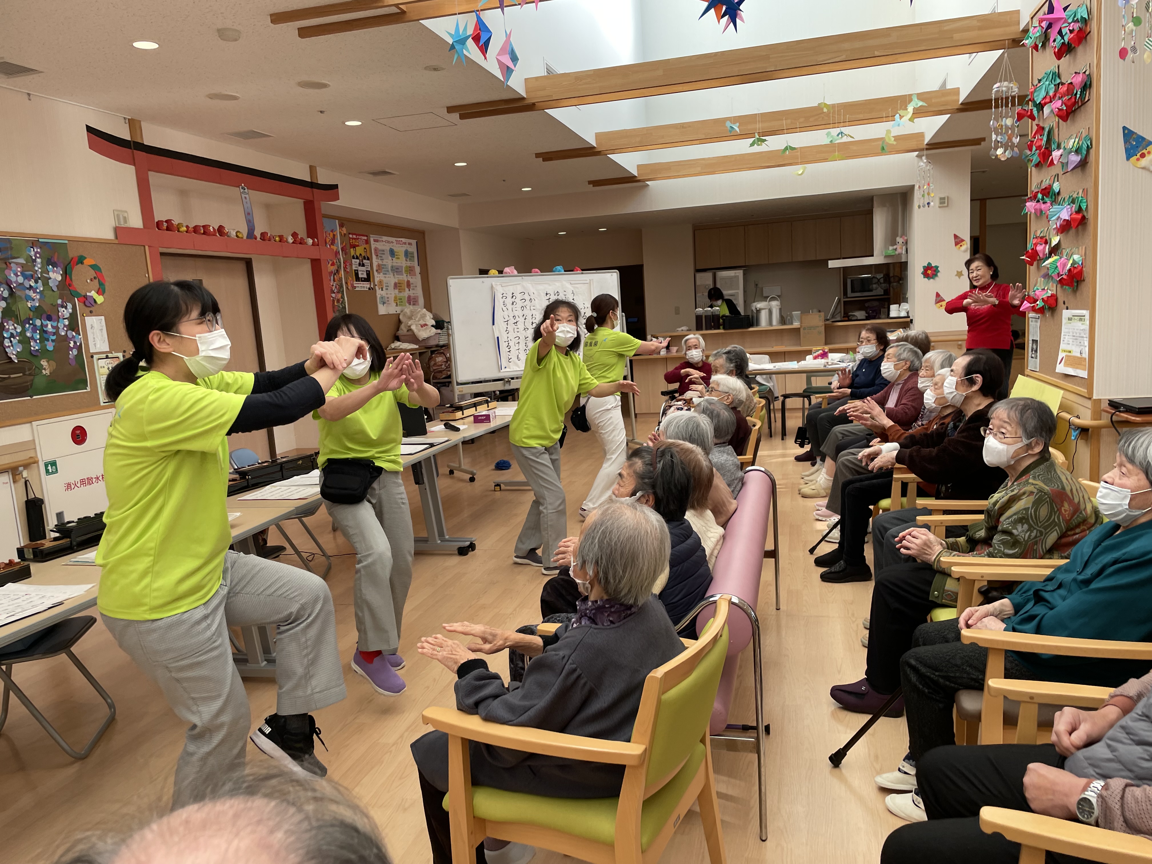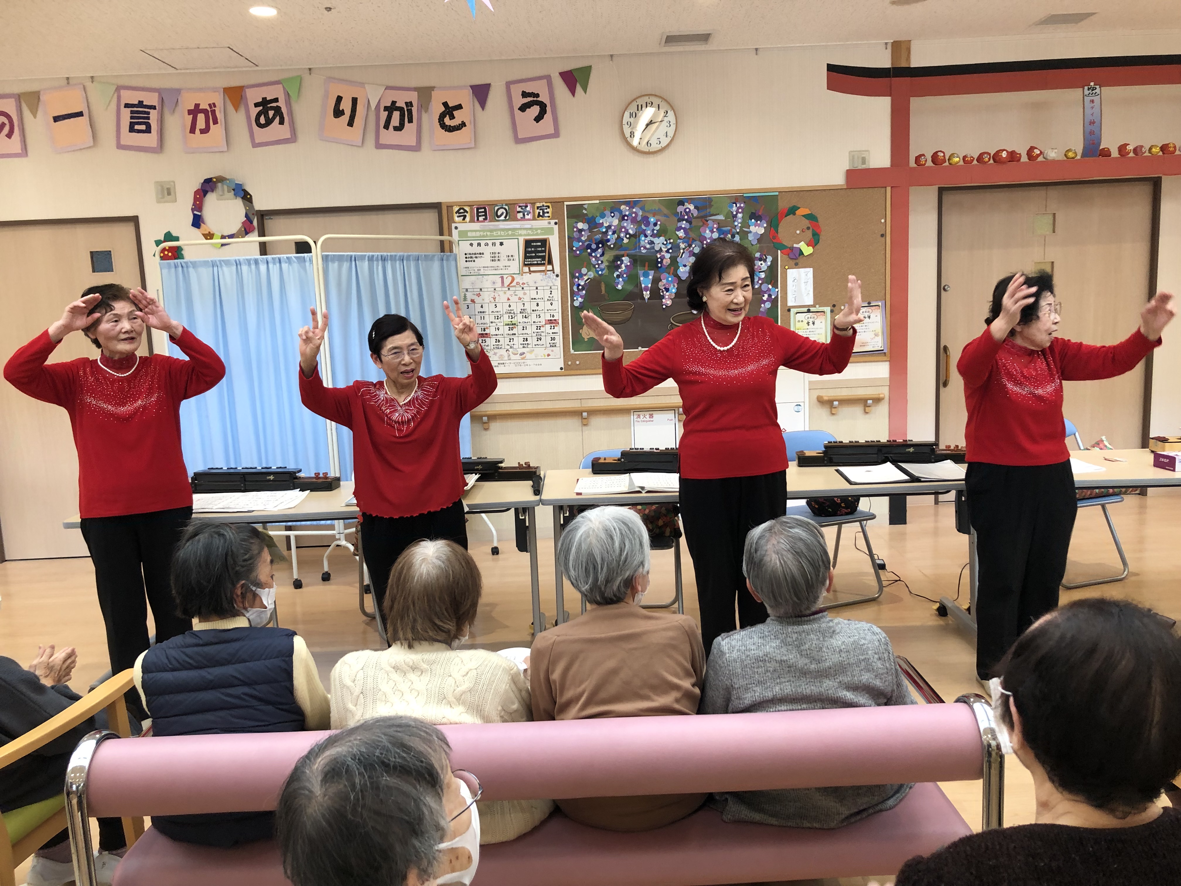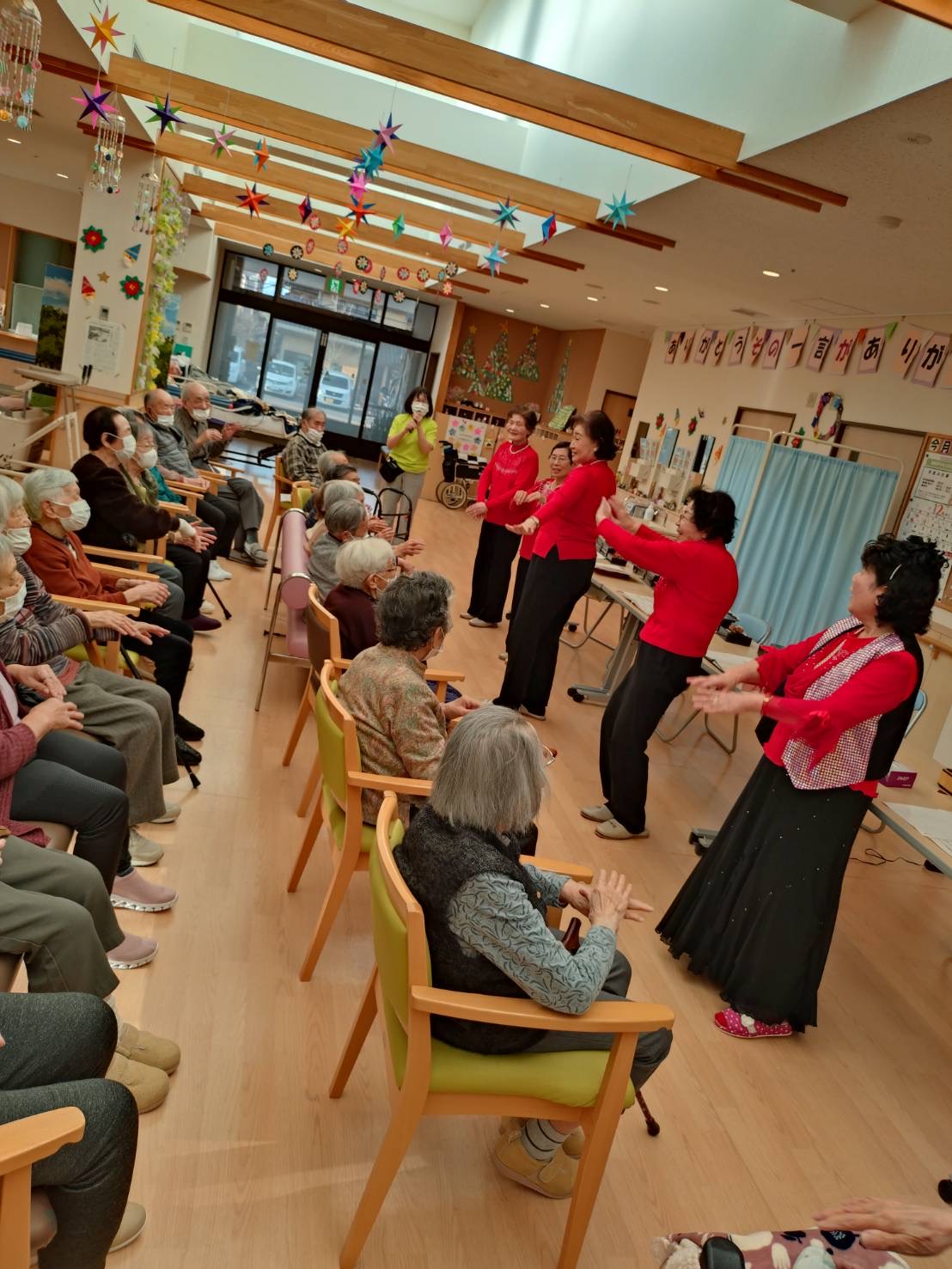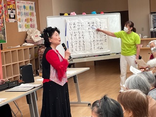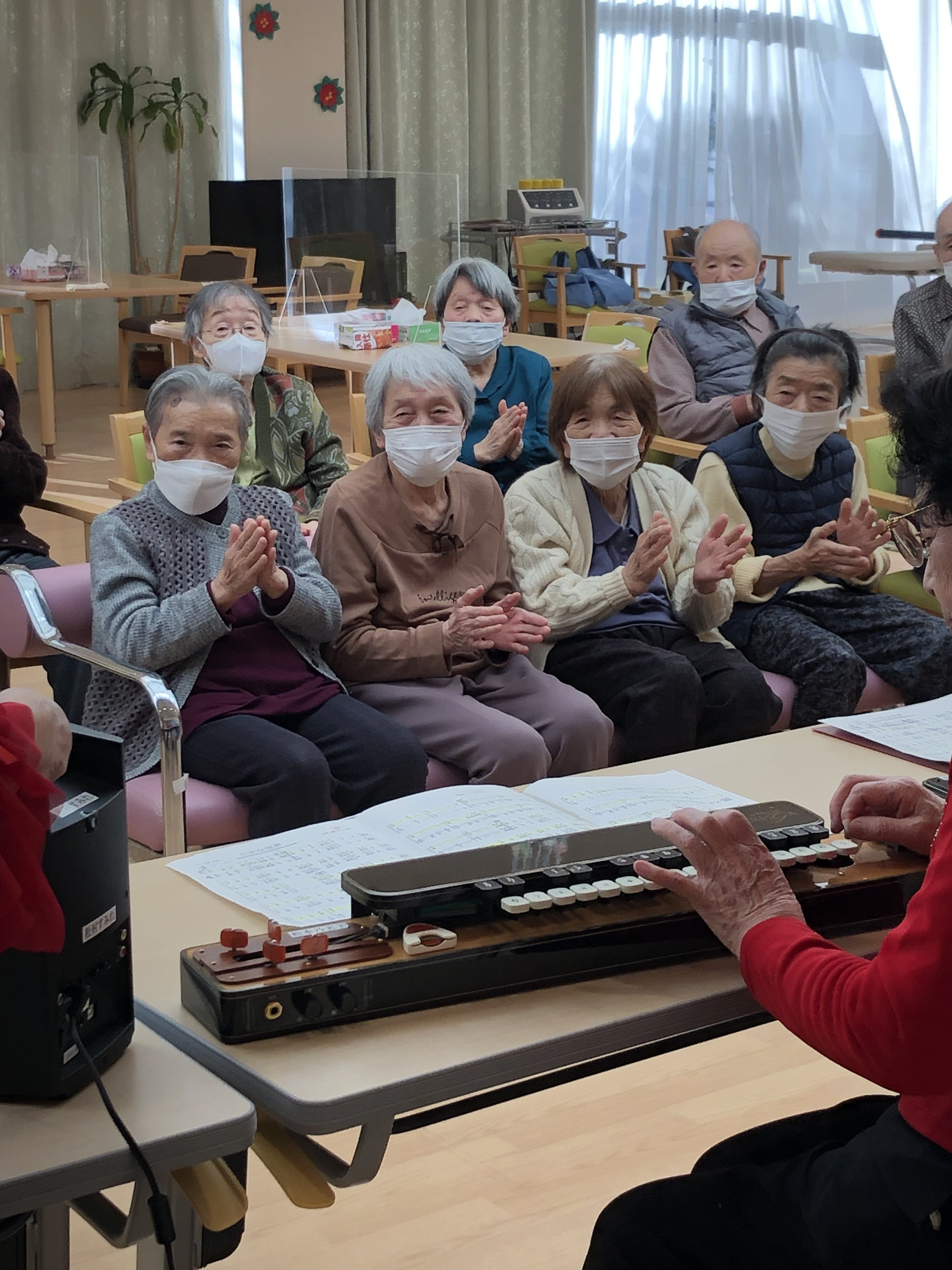 素敵な演奏は、もちろん、先生の軽快でユーモラスなトークや演奏に合わせたご利用者さんの合唱、またその歌に合わせたダンスなど、笑顔盛りだくさんの会となりました😊