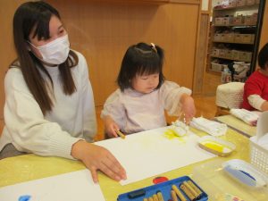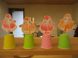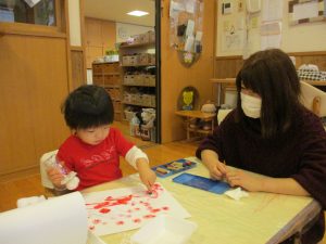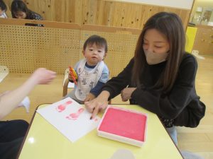 絵本を見たり、元気なお返事はぁ~いをしたり、触れ合い遊び、色々な製作も楽しみました。