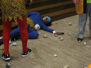 今年は年男が10名。あいさつの後、鬼が登場するやいなや開始を待たずに、豆に見立てた丸めた新聞紙を一斉に集中砲火。
