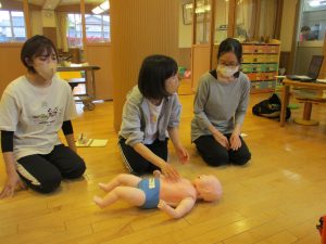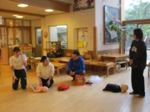 先日は嘔吐、痙攣対応研修。今日は卒園児の保護者である救急救命士の保護者の方を講師にお招きし、心肺蘇生法やエピペン対応について学びました。