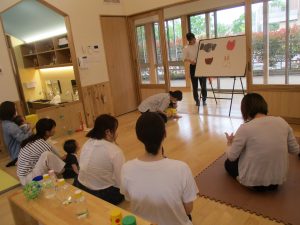 親子で遊んだり、「いないいないばあ」のパネルシアターを楽しみました。