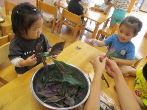 たんぽぽ組もお手伝いをして金時草の葉を茎からはずしました。