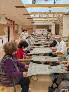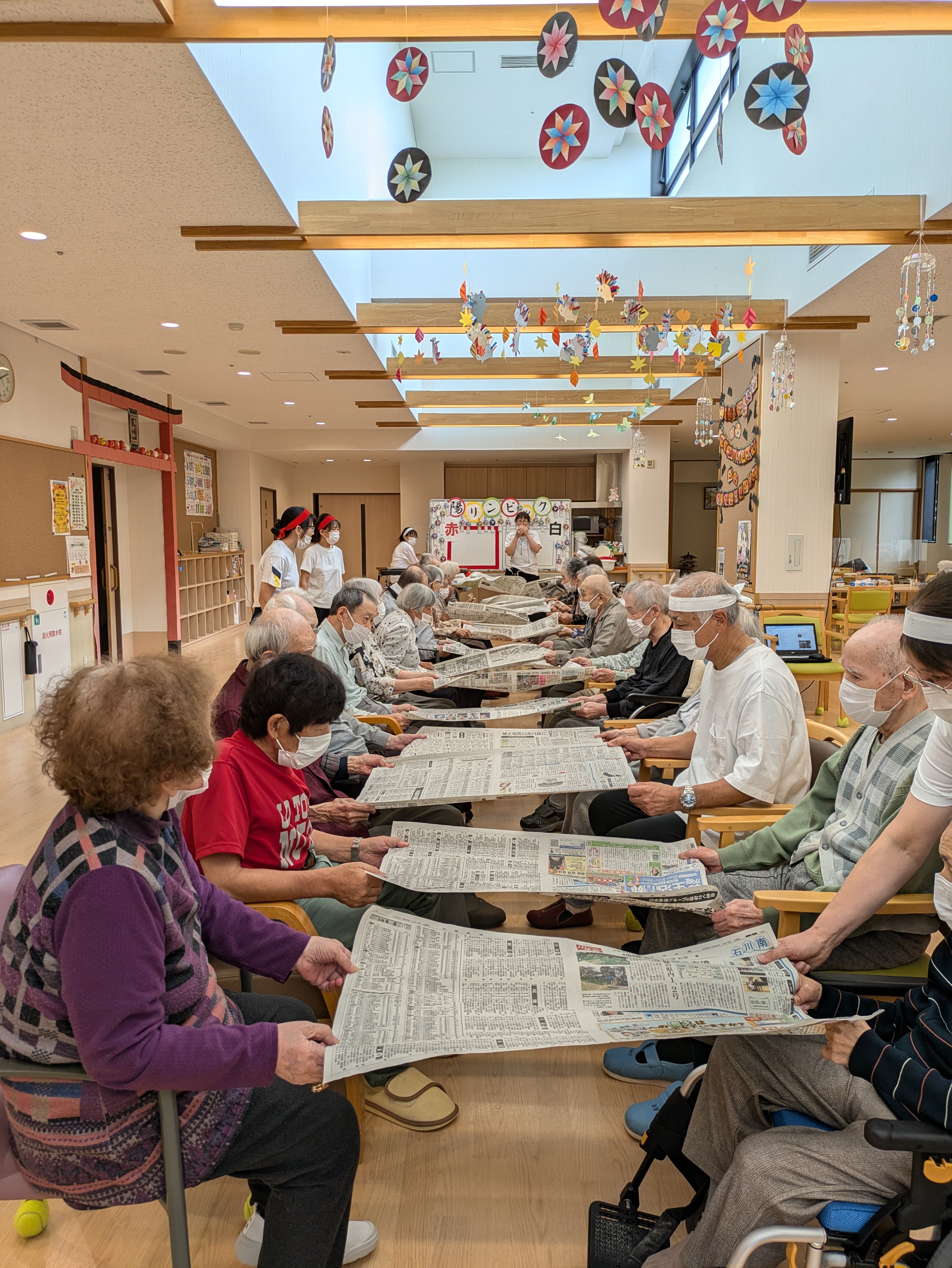 新聞紙を引っ張り合う、新聞綱引き!体操の音楽が止まったら投げる、体操玉入れ!!