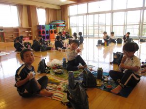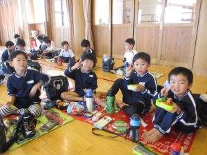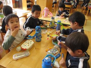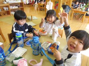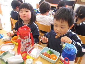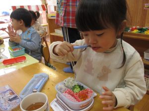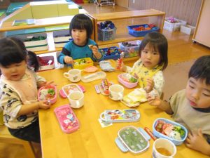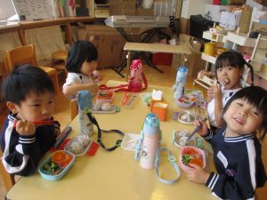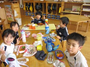 生憎のお天気で戸外では食べられませんでしたが、お部屋や遊戯室でお友達と一緒に食べました。