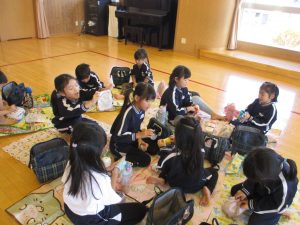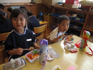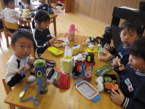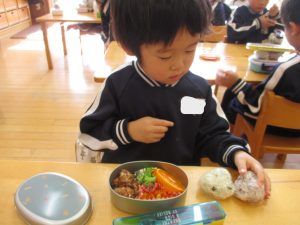 たんぽぽ組からひまわり組までが、お家から持ってきていただいたお弁当箱に給食先生が作ったおかずとおにぎりとデザートを入れておべんとうごっこ!