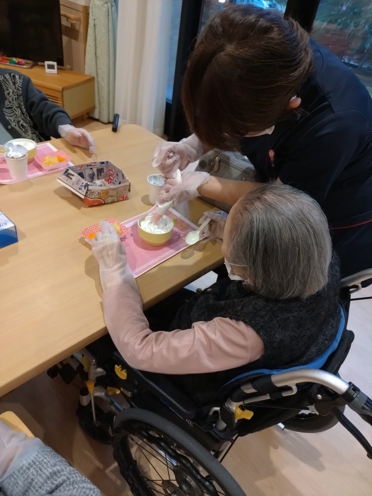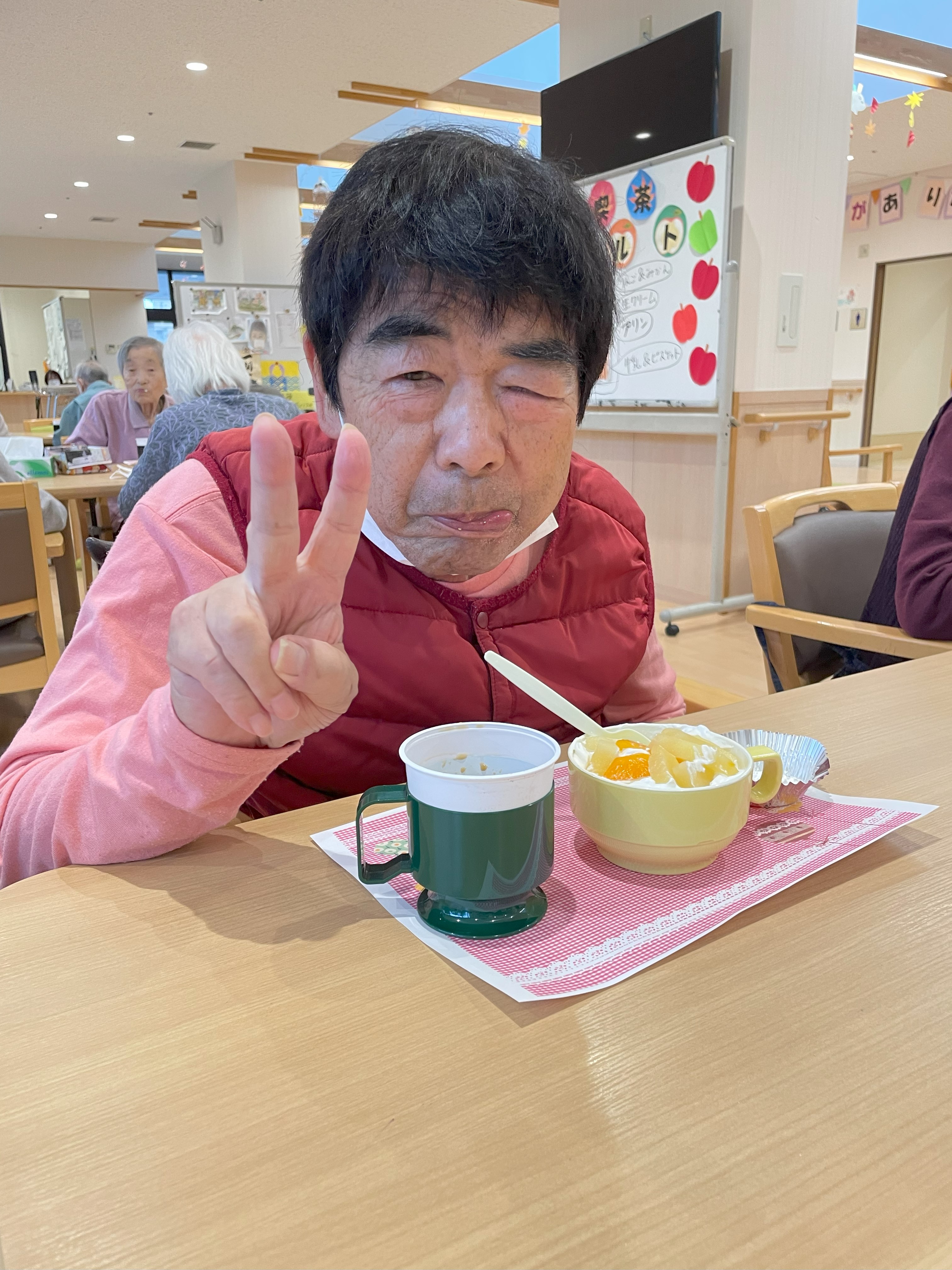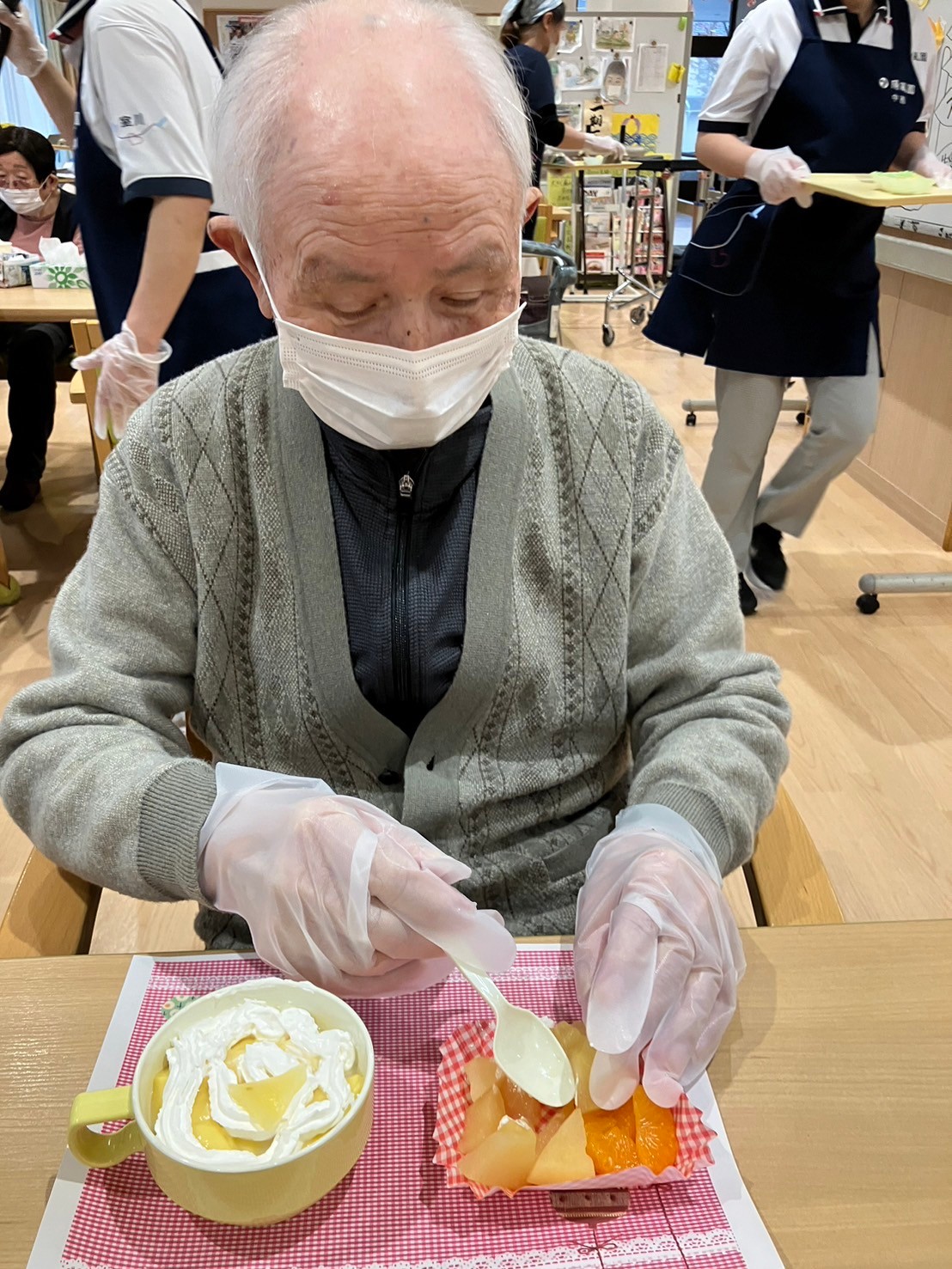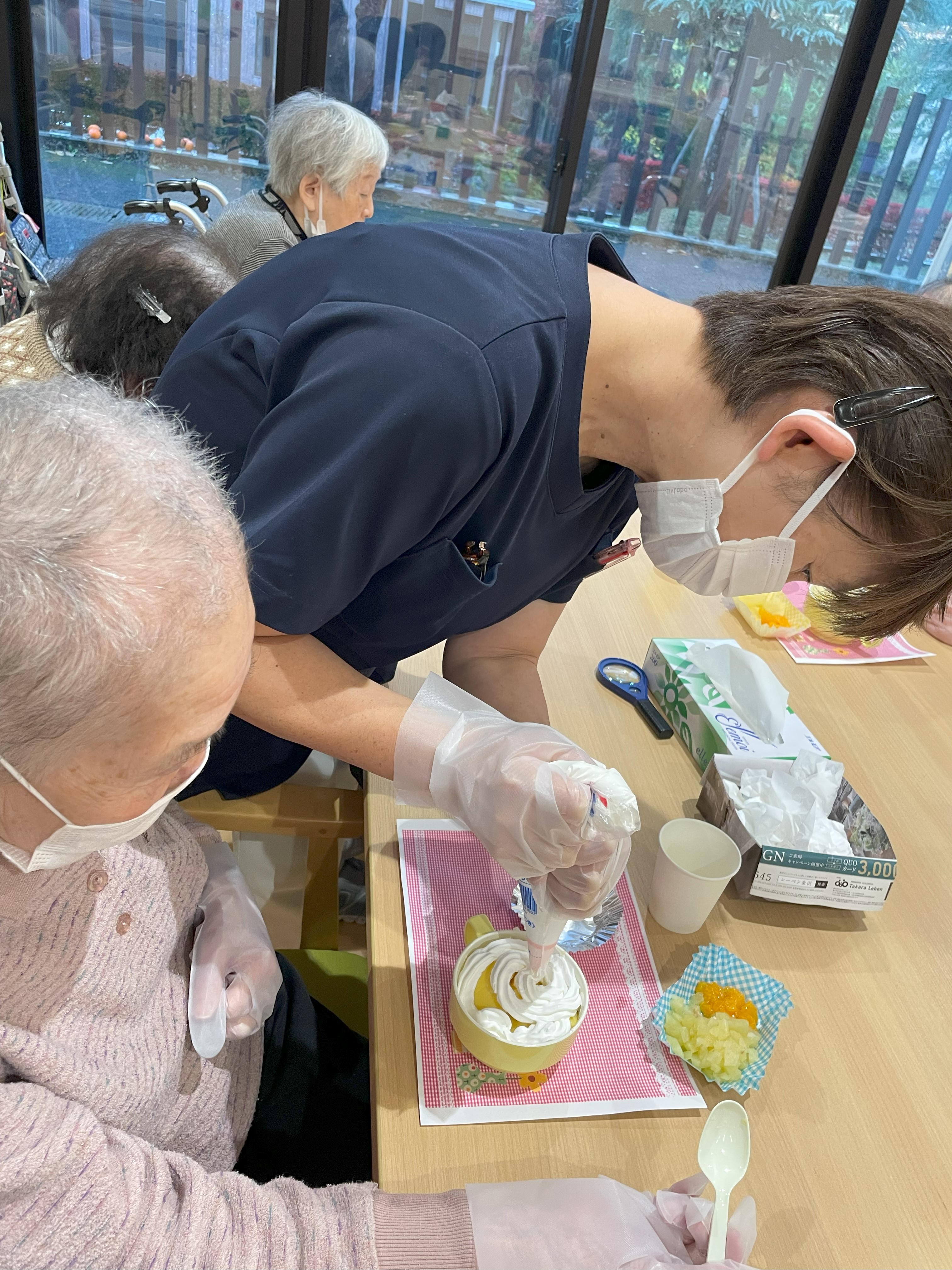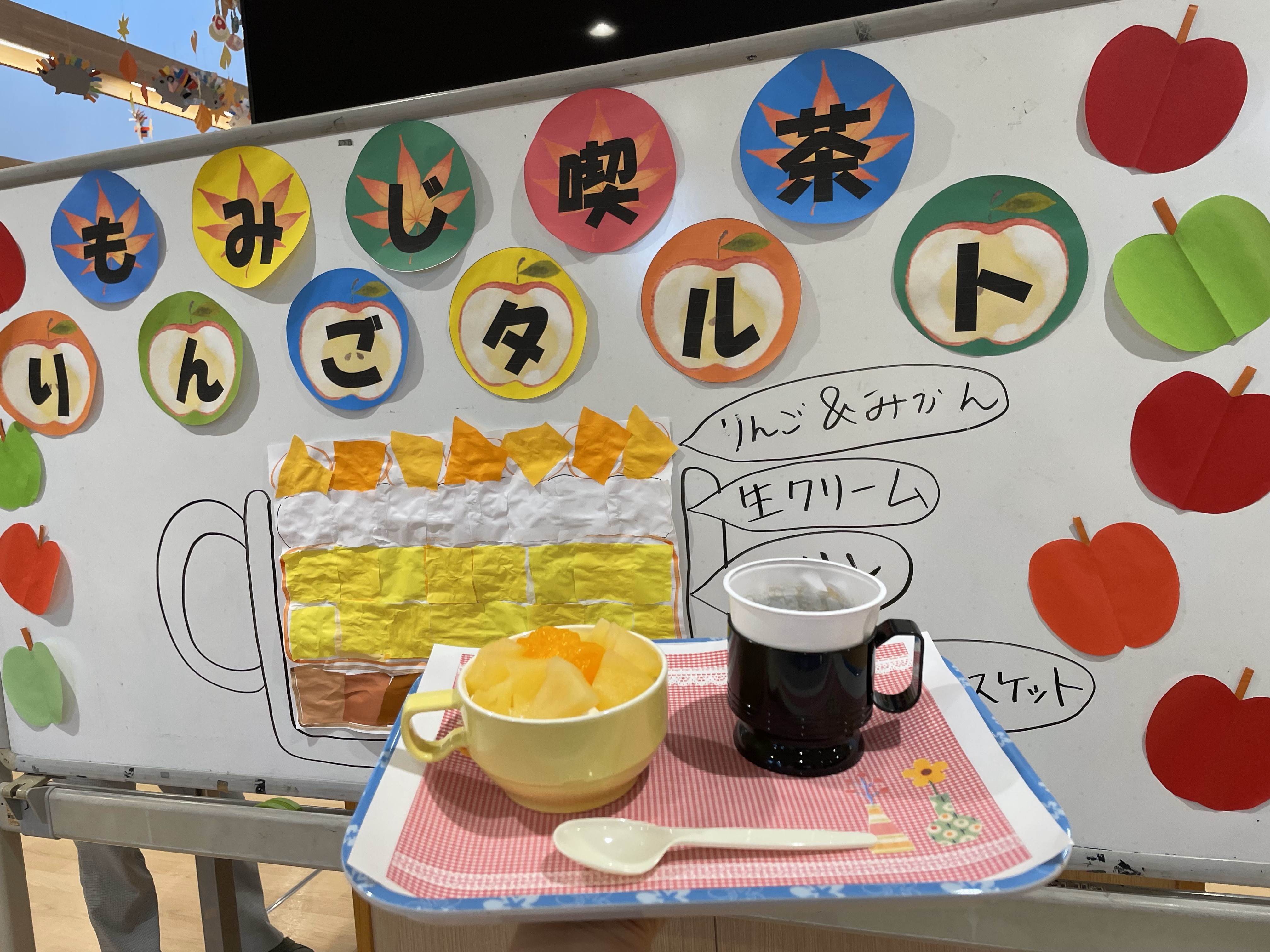 紅葉喫茶 ~ りんごタルト🍎 ~ 陽風園デイサービスセンター2024年11月30日 秋カフェ第2弾「紅葉喫茶🍁」は、今が旬のリンゴを使った「りんごタルト🍎」です♪ 牛乳にビスケットを浸し、混ぜて混ぜてタルト生地をつくります! その上にプリンを乗せたら、職員が生クリームを絞りにやってきます!! 最後に、たっぷりのリンゴの甘煮とミカンを素敵にデコレーションしたら、完成です🍎 コーヒーと一緒に、召し上がれ♪ おいしい顔がいっぱいです😊💖 おいしいものを食べると、笑顔になりますね😊💖 次回の喫茶も、お楽しみに♪