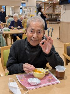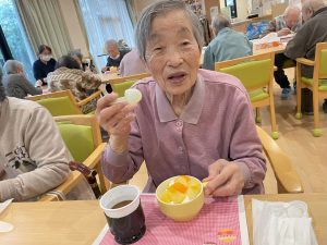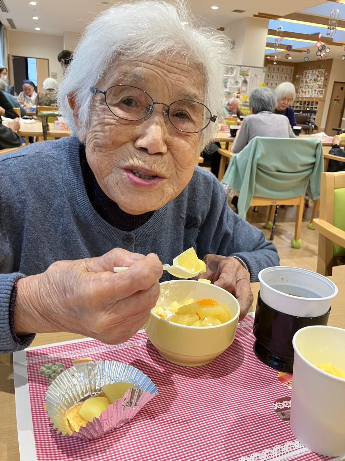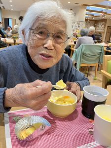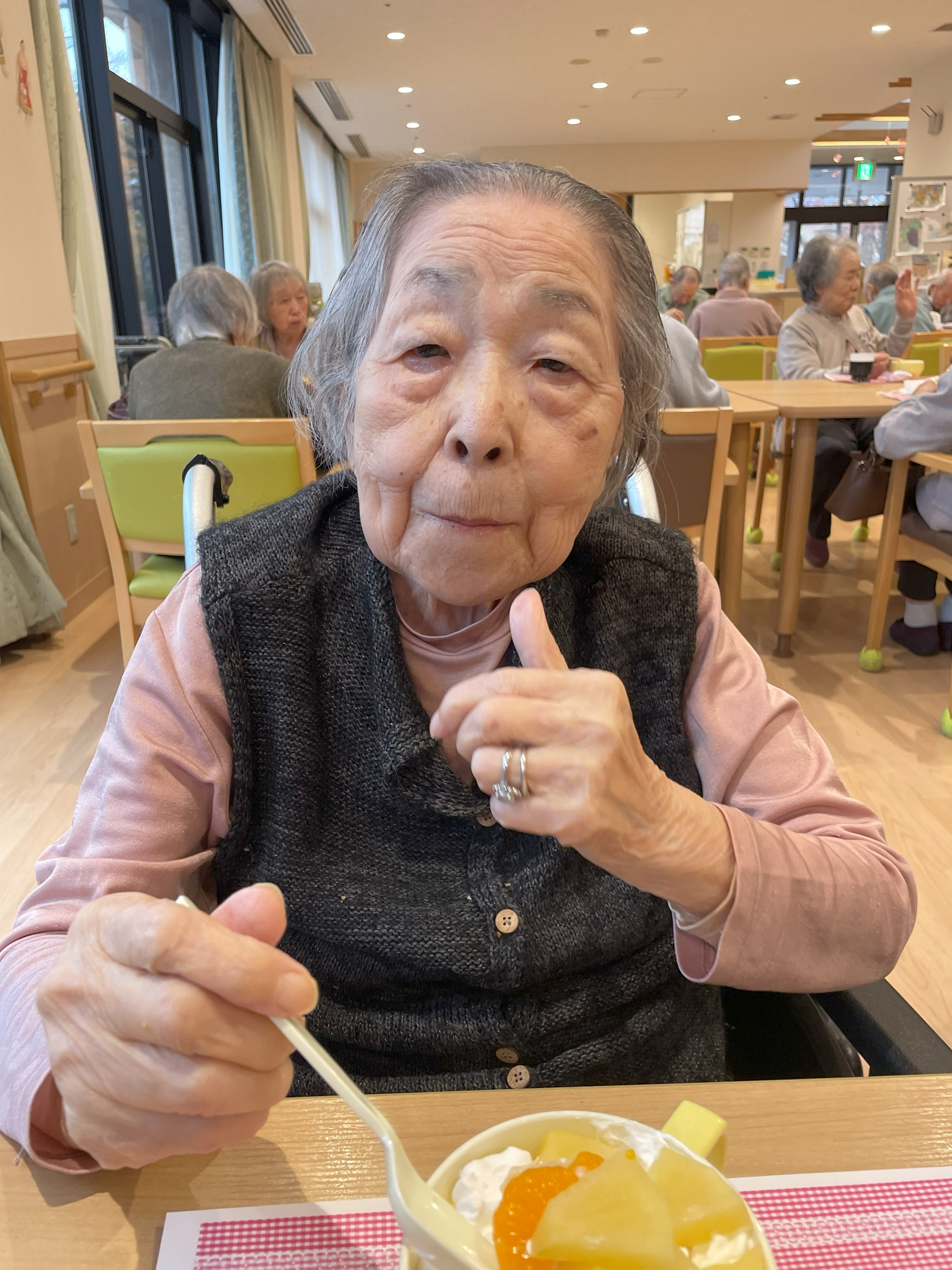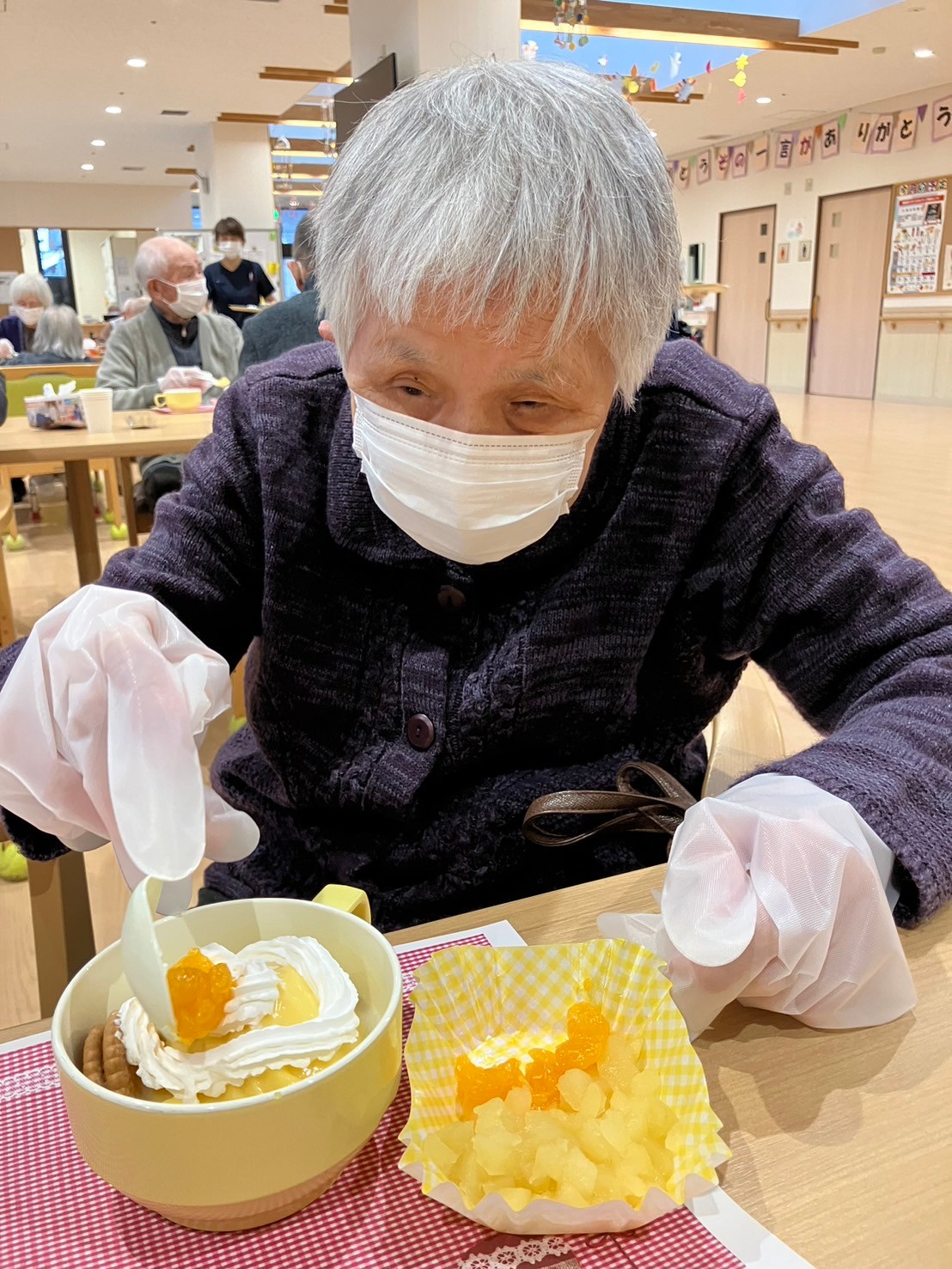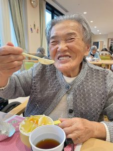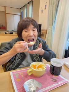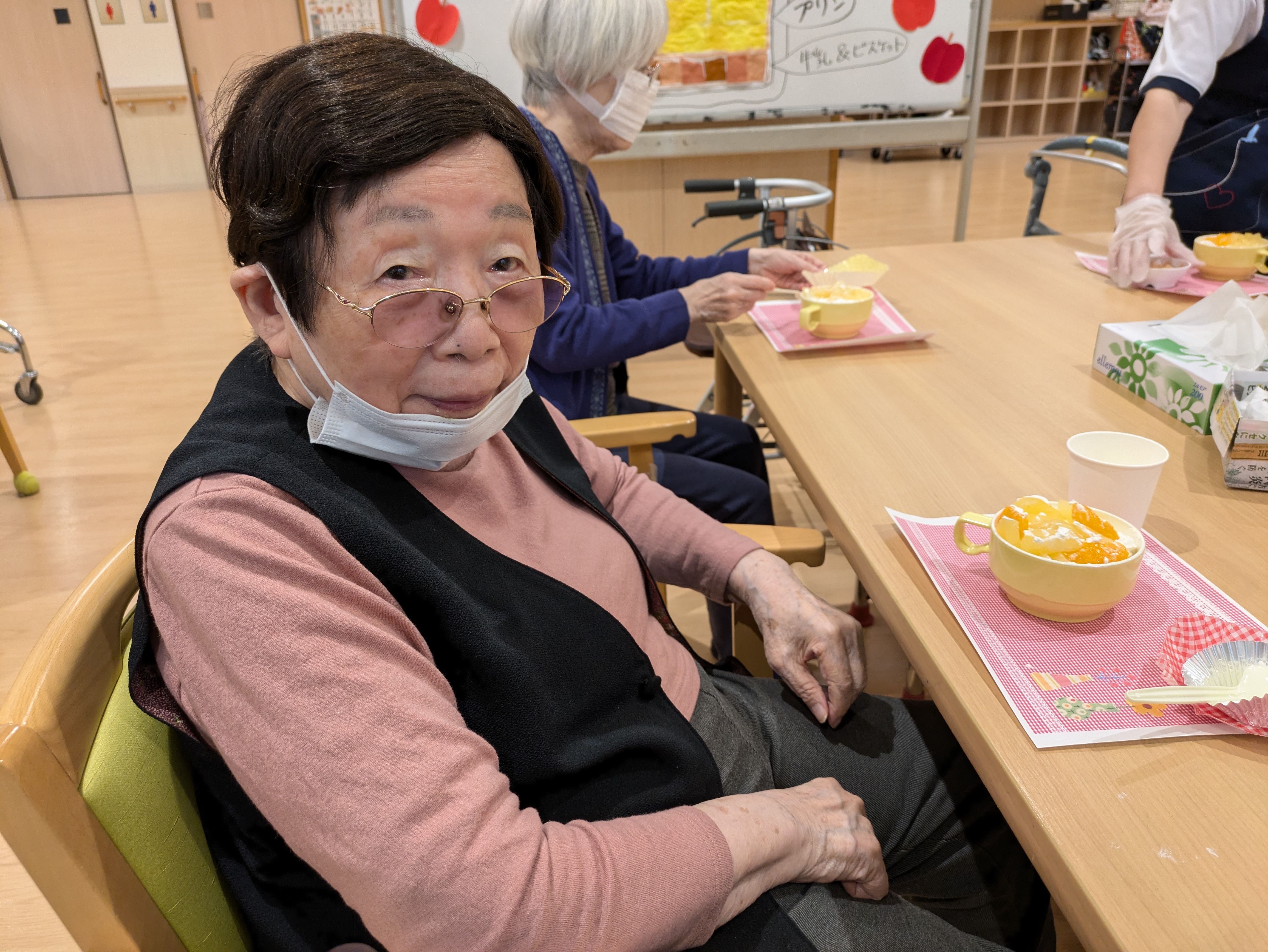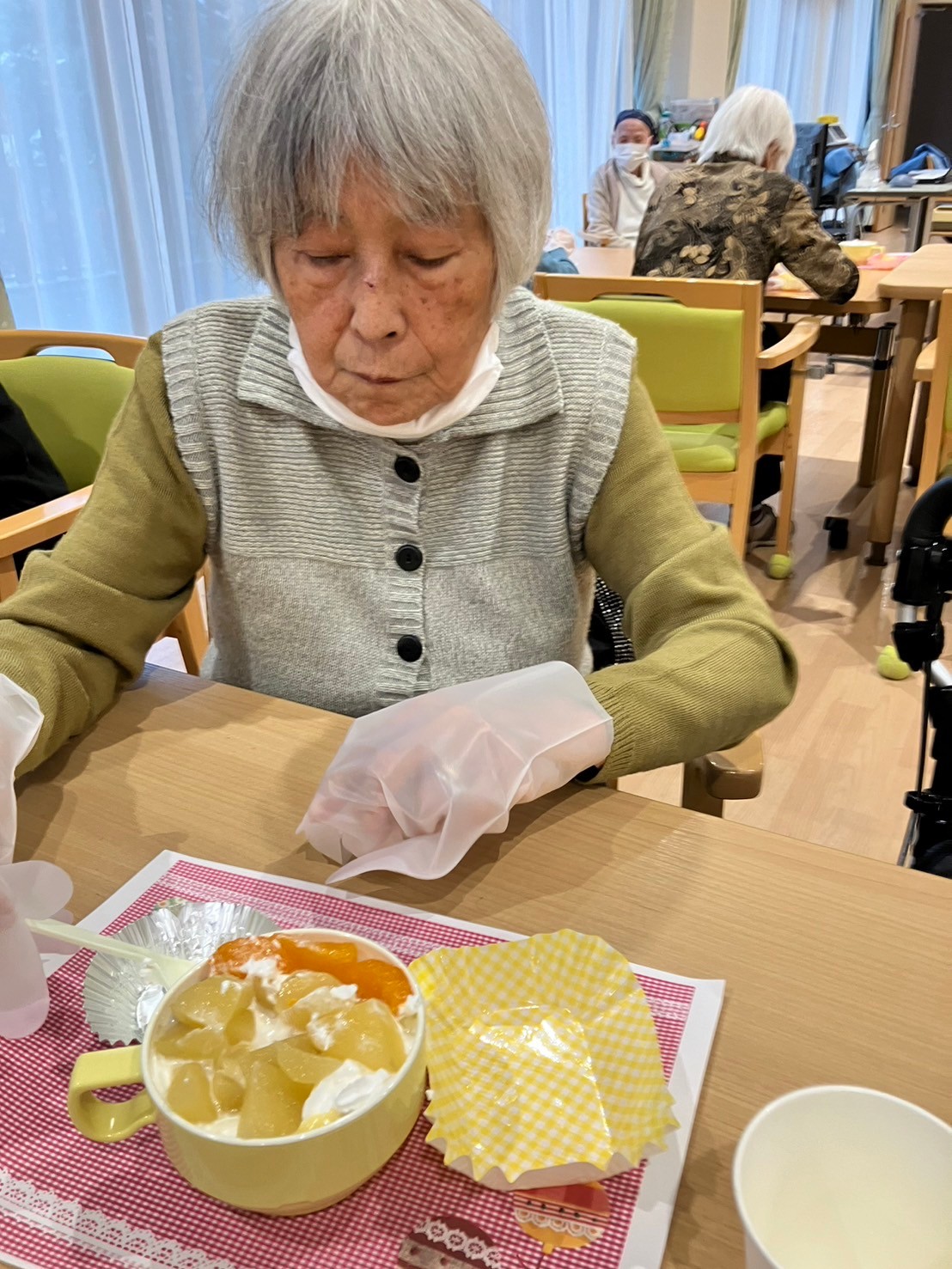 紅葉喫茶 ~ りんごタルト🍎 ~ 陽風園デイサービスセンター2024年11月30日 秋カフェ第2弾「紅葉喫茶🍁」は、今が旬のリンゴを使った「りんごタルト🍎」です♪ 牛乳にビスケットを浸し、混ぜて混ぜてタルト生地をつくります! その上にプリンを乗せたら、職員が生クリームを絞りにやってきます!! 最後に、たっぷりのリンゴの甘煮とミカンを素敵にデコレーションしたら、完成です🍎 コーヒーと一緒に、召し上がれ♪ おいしい顔がいっぱいです😊💖 おいしいものを食べると、笑顔になりますね😊💖 次回の喫茶も、お楽しみに♪