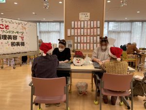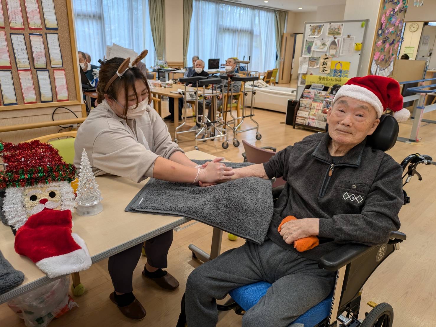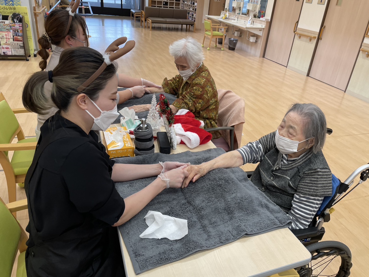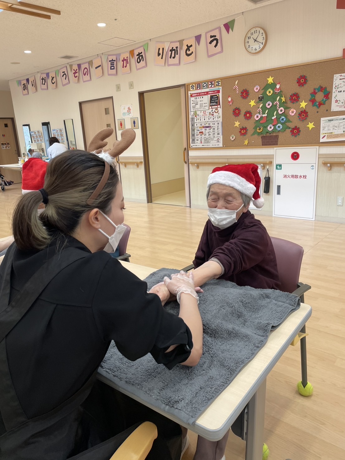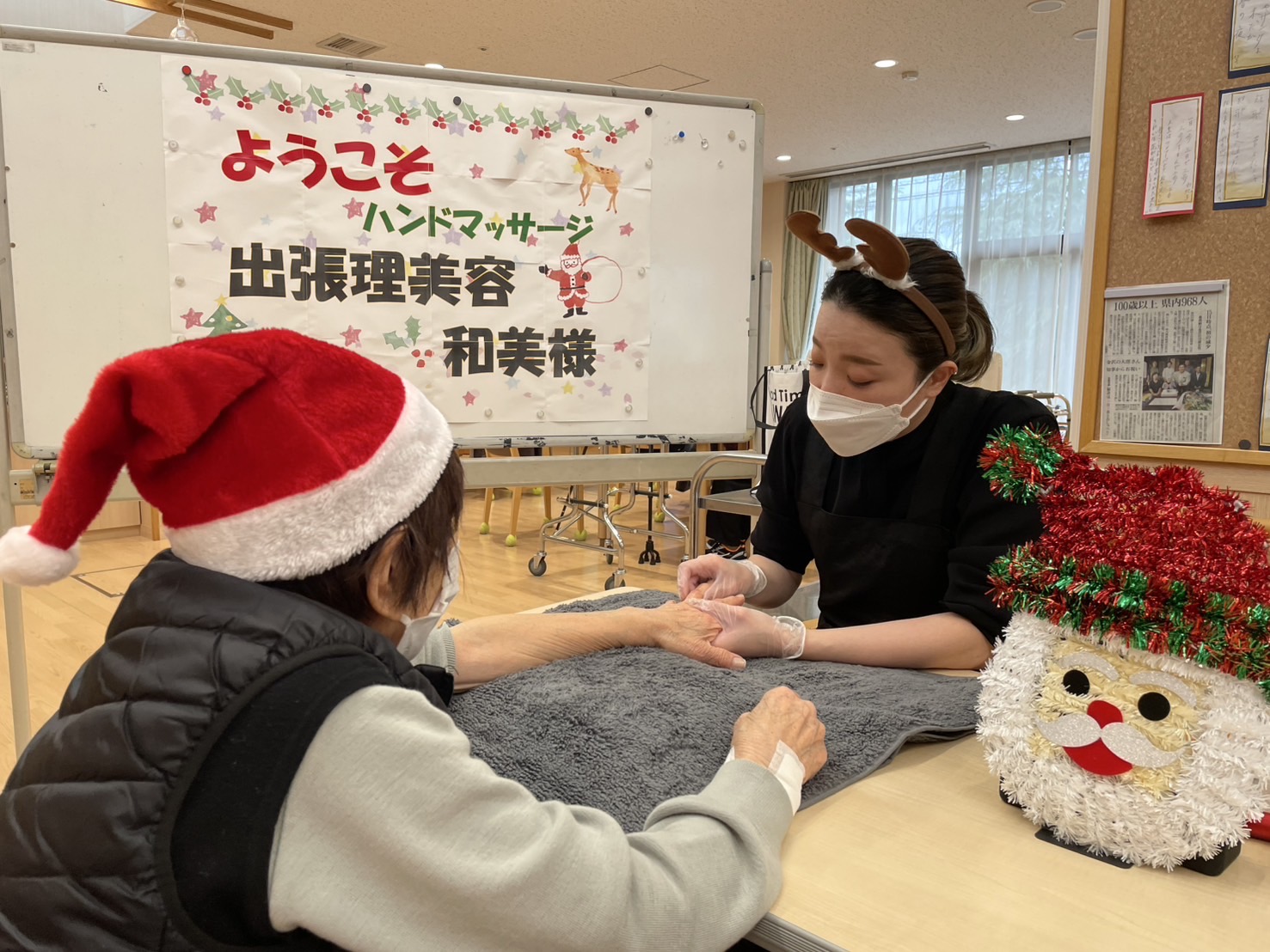 ハンドマッサージ ボランティア 陽風園デイサービスセンター2024年12月18日 出張理美容 和美さんからのご紹介で、ハンドマッサージに来てくださいました✋ オイルマッサージ初体験の方も多くおいでましたが、心地よい手技に皆さんリラ〜ックスした表情になっていました✨ クリスマスシーズンということで、かわいいトナカイとサンタクロースになりながら、まったりとしたお時間をお過ごし頂きました🎅🎄