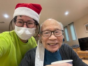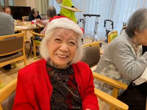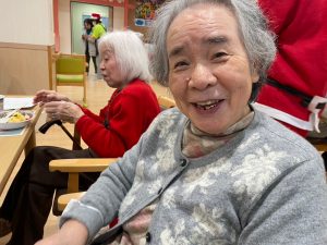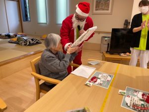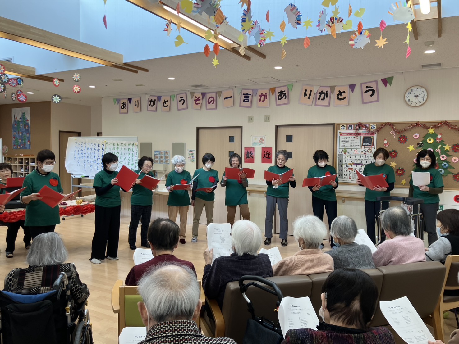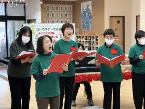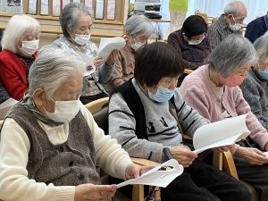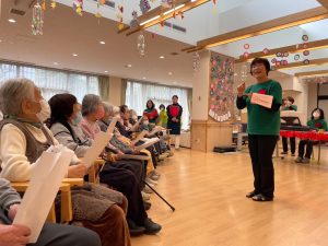 「もろびとこぞりて」や「ホワイトクリスマス」といったクリスマスソング、「この街で」を歌って頂き、童謡はご利用者の皆さんも一緒に歌いました。追いかけっこ方式の歌唱で音程をとることが難しく、ズレた感じに笑い声が聞こえてきましたね♪