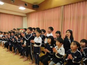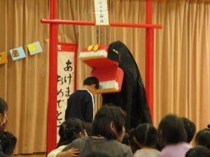 子どもたちは保育教諭の「十二支のはなし」の劇を見たり、獅子と新年を祝い園長先生より美味しいお年玉もいただきました。