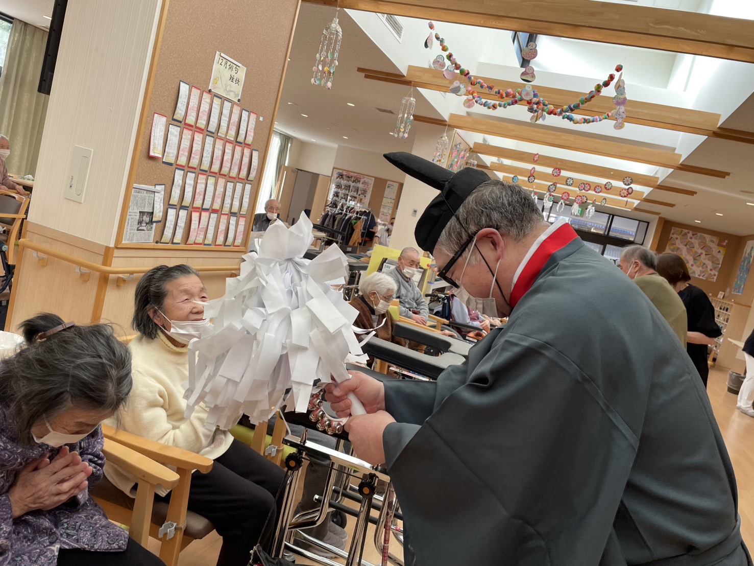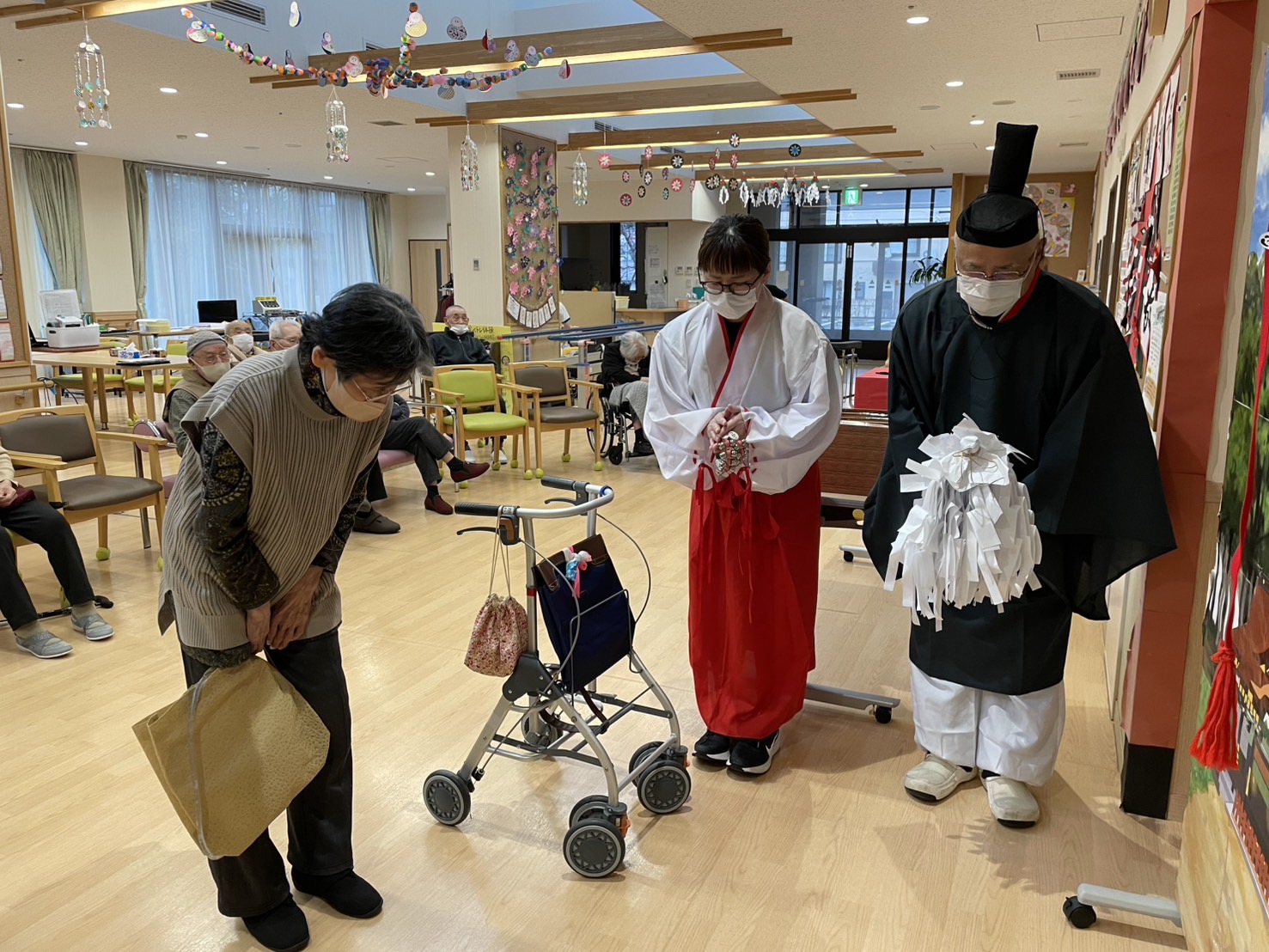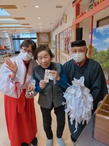まずはセンター内に設けた神社前で、お祓いを受けお参りをして頂きます。