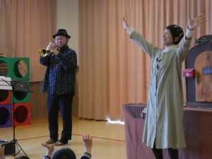 人形劇屋さんとトランぺッターの佐渡涼さんが可愛いお話と素敵な音楽を子どもたちに届けてくださいました。