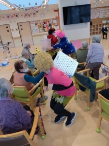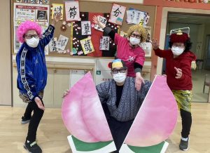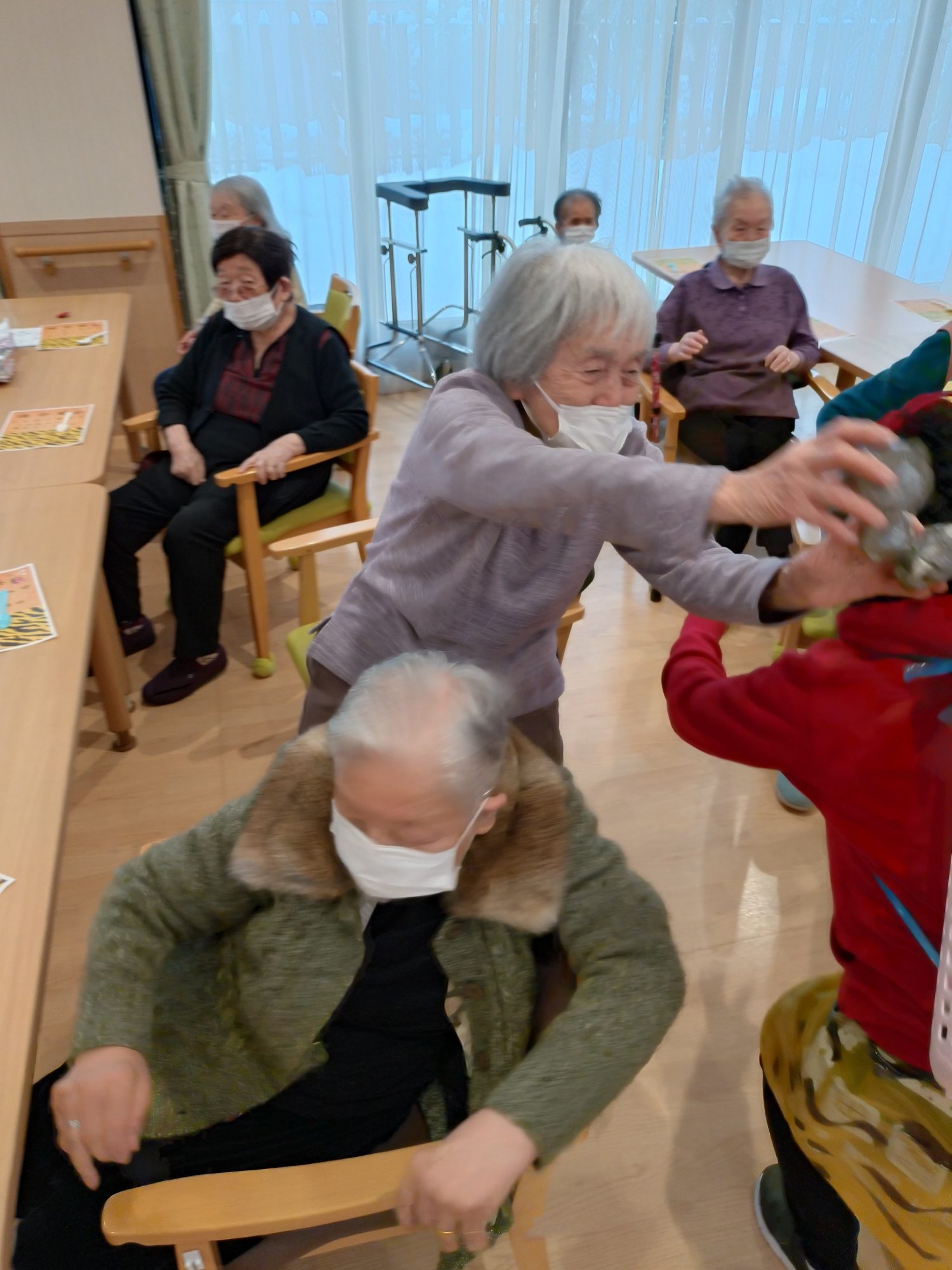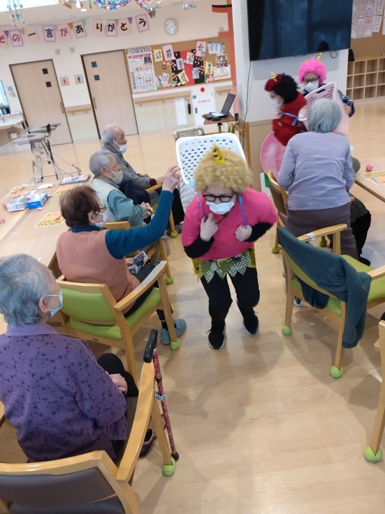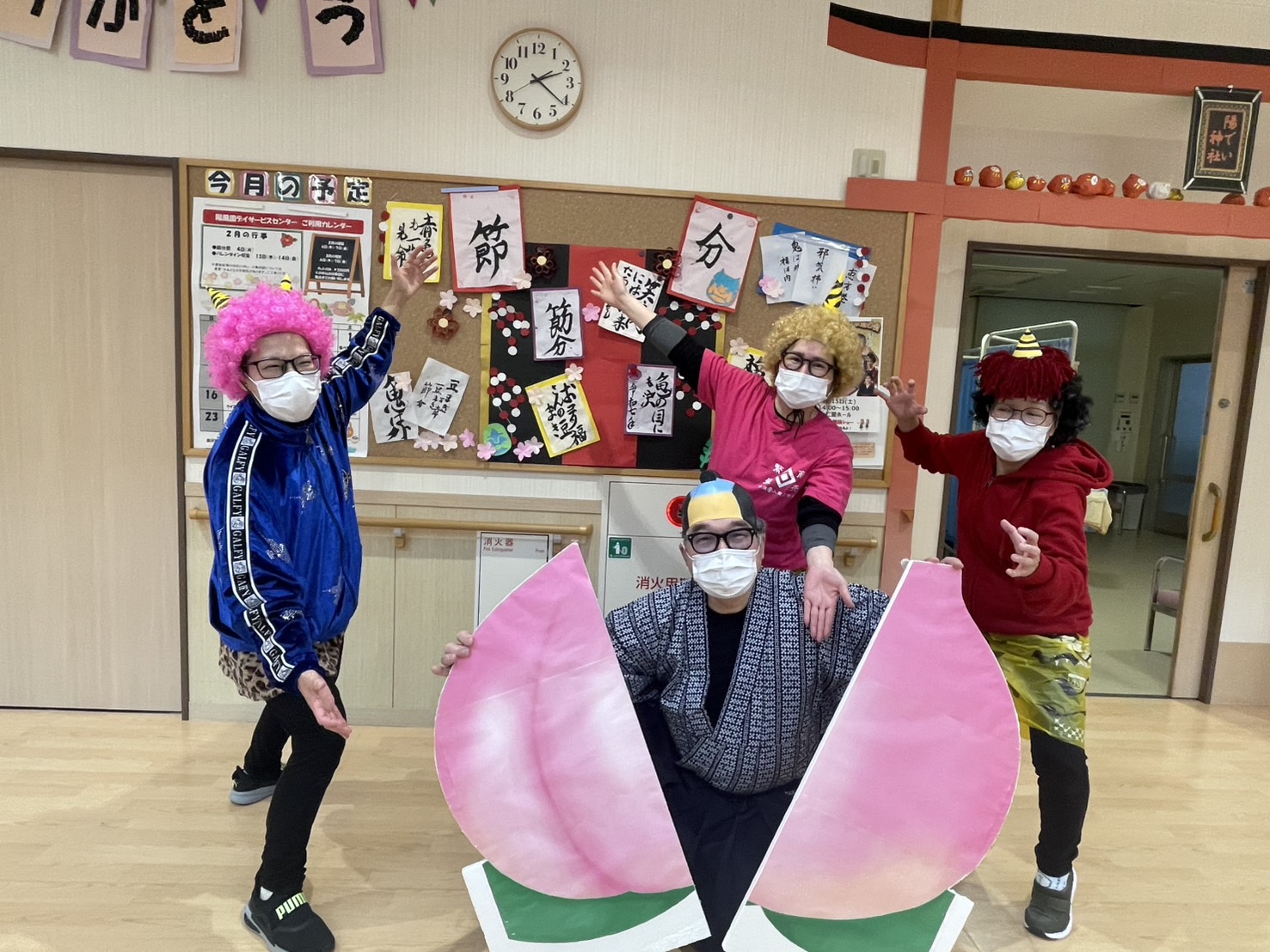 節分祭👹 陽風園デイサービスセンター2025年2月20日 今年の節分祭、テーマは「桃太郎の鬼退治👹」 当デイサービス自慢のイケメン桃太郎チームと、ヤンキー風鬼チームに分かれての、玉入れゲームを行いました。 チーム戦!と言われると気合いが入るようで、皆さん普段の体操では見られないような俊敏な動きを見せて下さいました♪ 身体を動かした後には、鬼型の上生菓子。「かわいい~♪」「食べるのもったいないわ😊💖」と言いながら、最後の鬼退治です👹 今年も、鬼は外!福は内!!の1年になりますように・・・