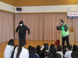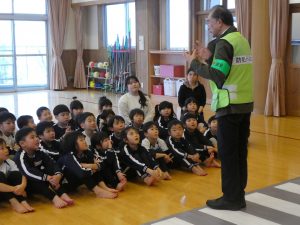 防犯標語の「いかのおすし」不審者を見分けるための合言葉「はちみつじまん」など学校に行くときの大切なことをみんなで確認しながら教えていただきました。