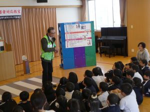 2月20日(木)に、キッズサポート隊の平隊長の防犯紙芝居教室があり年長児ひまわり組42名が参加しました。