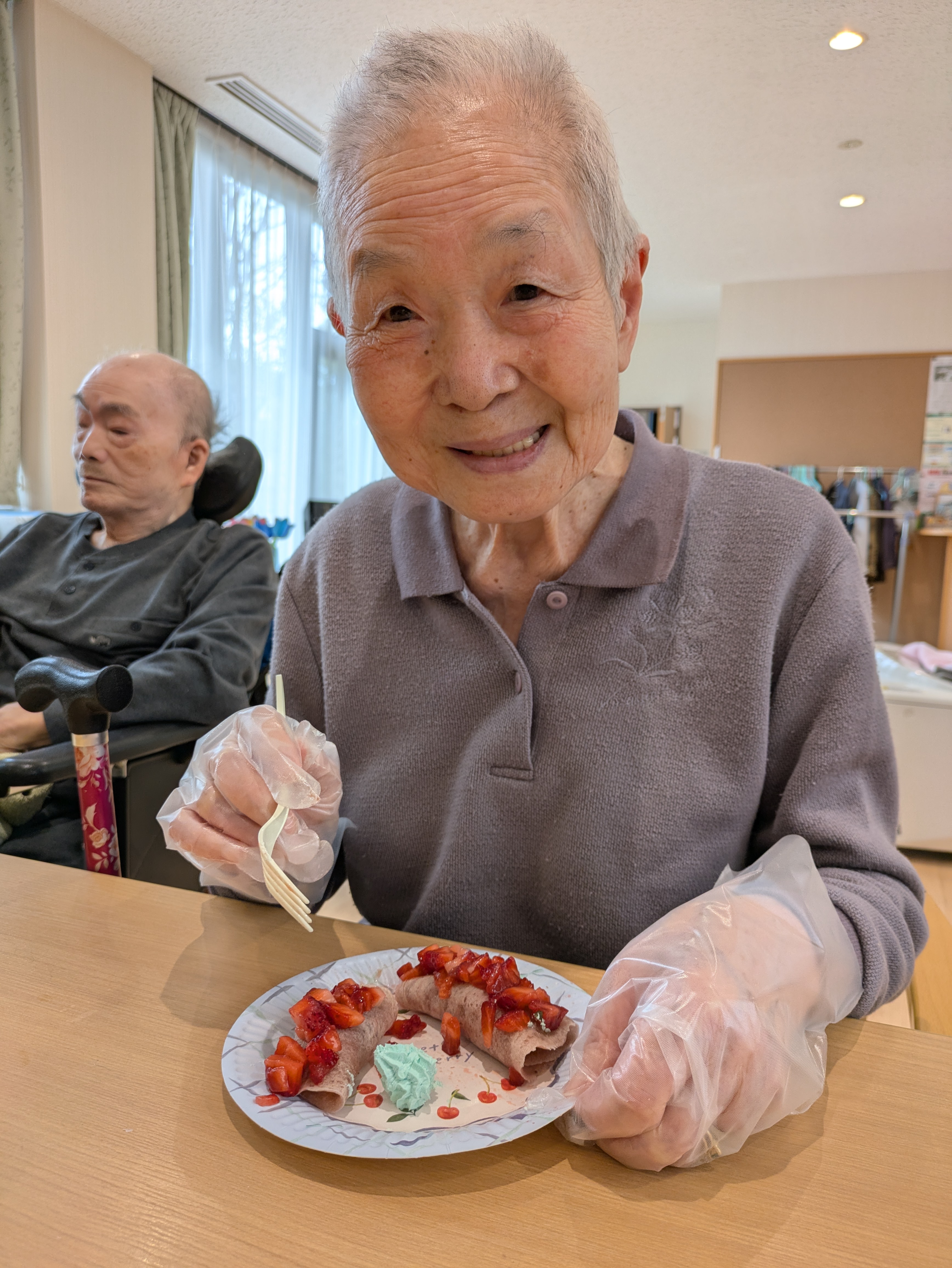あんこを丸めて、皮に包めば、お手製桜もちの出来上がり!!イチゴとクリームも添えました🍓