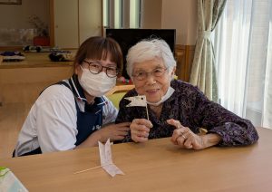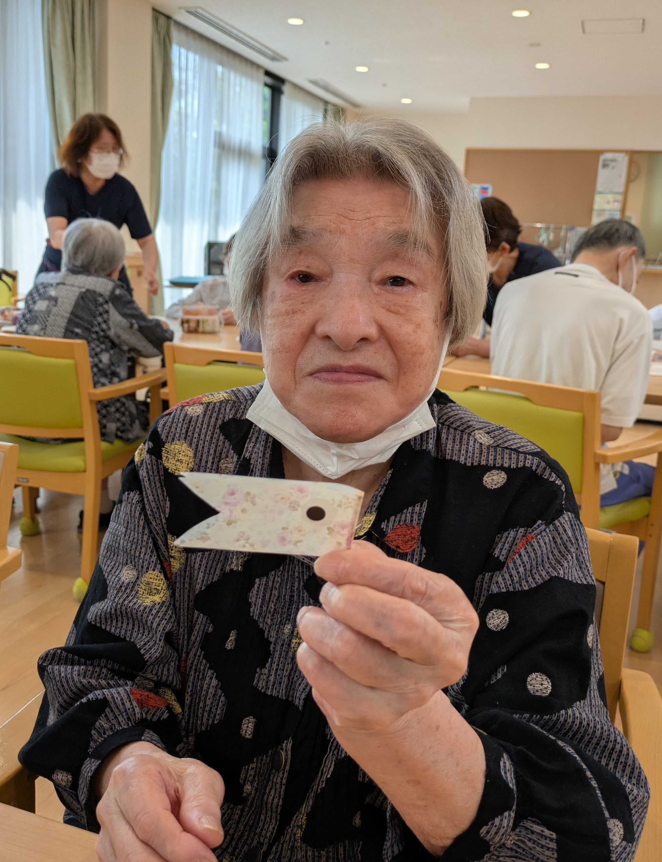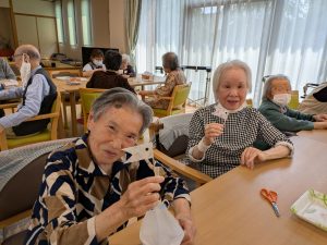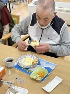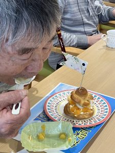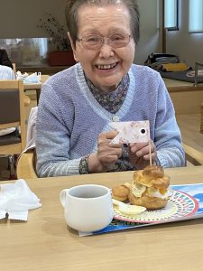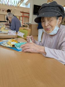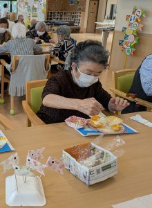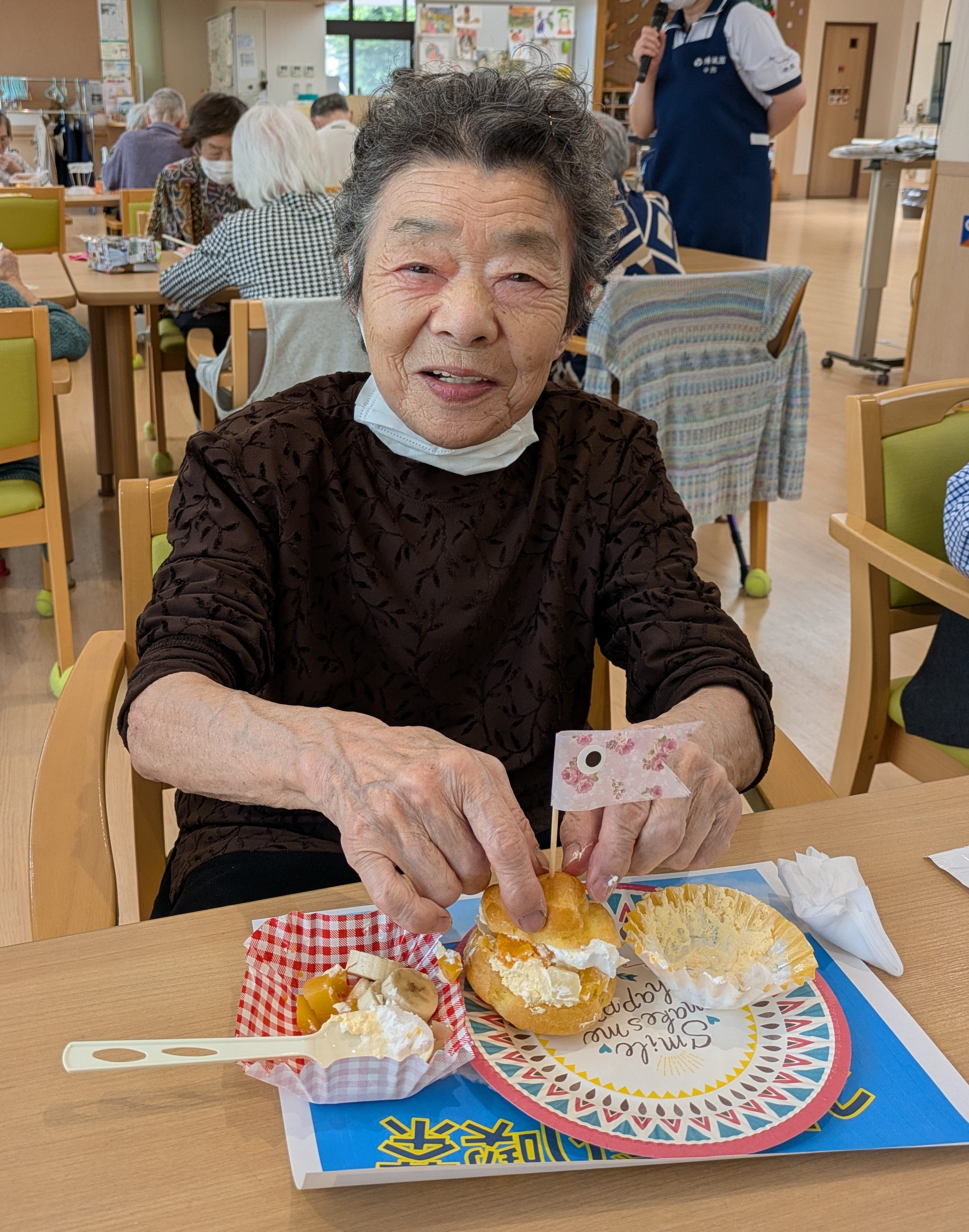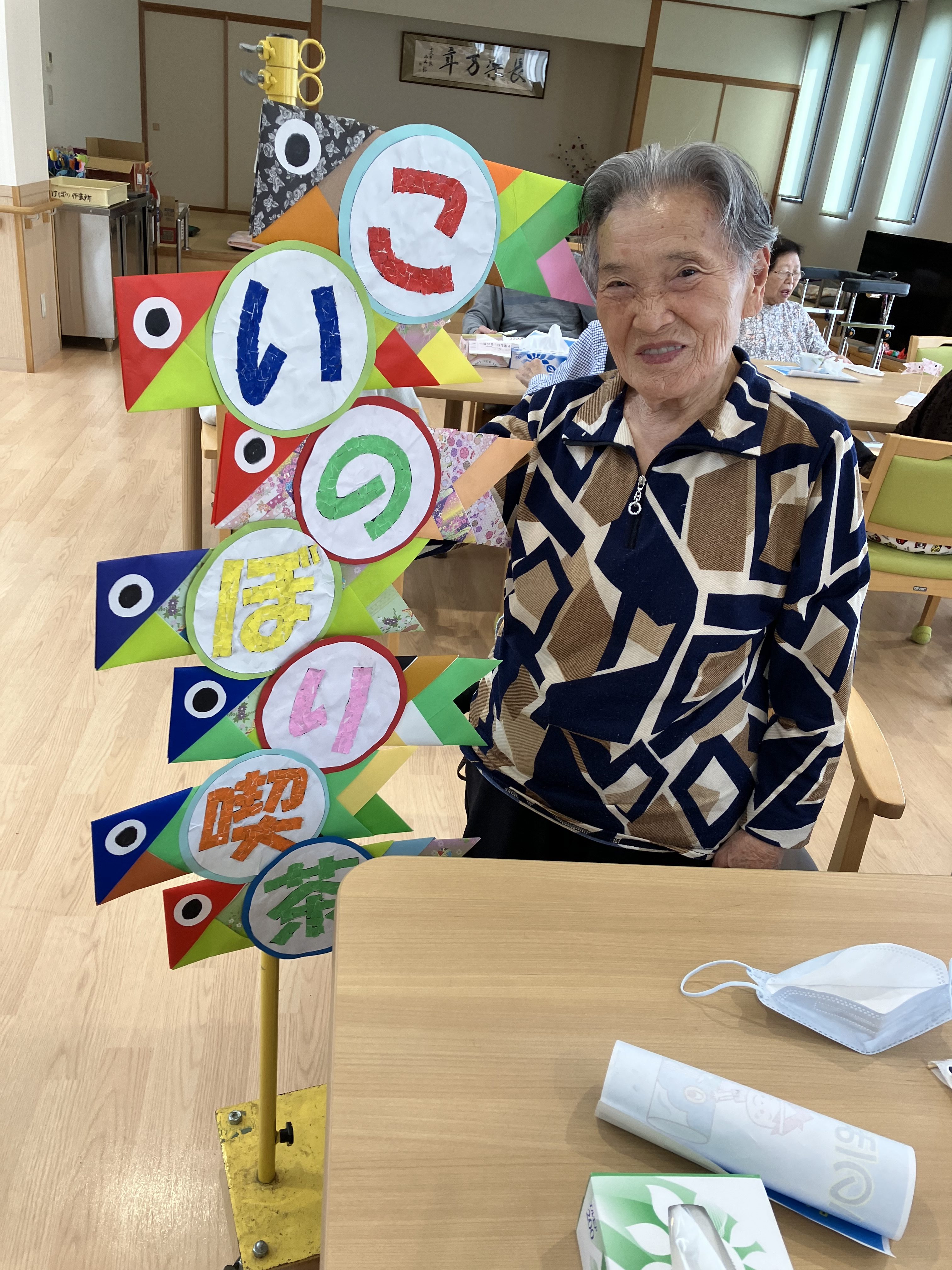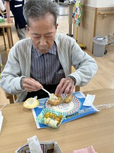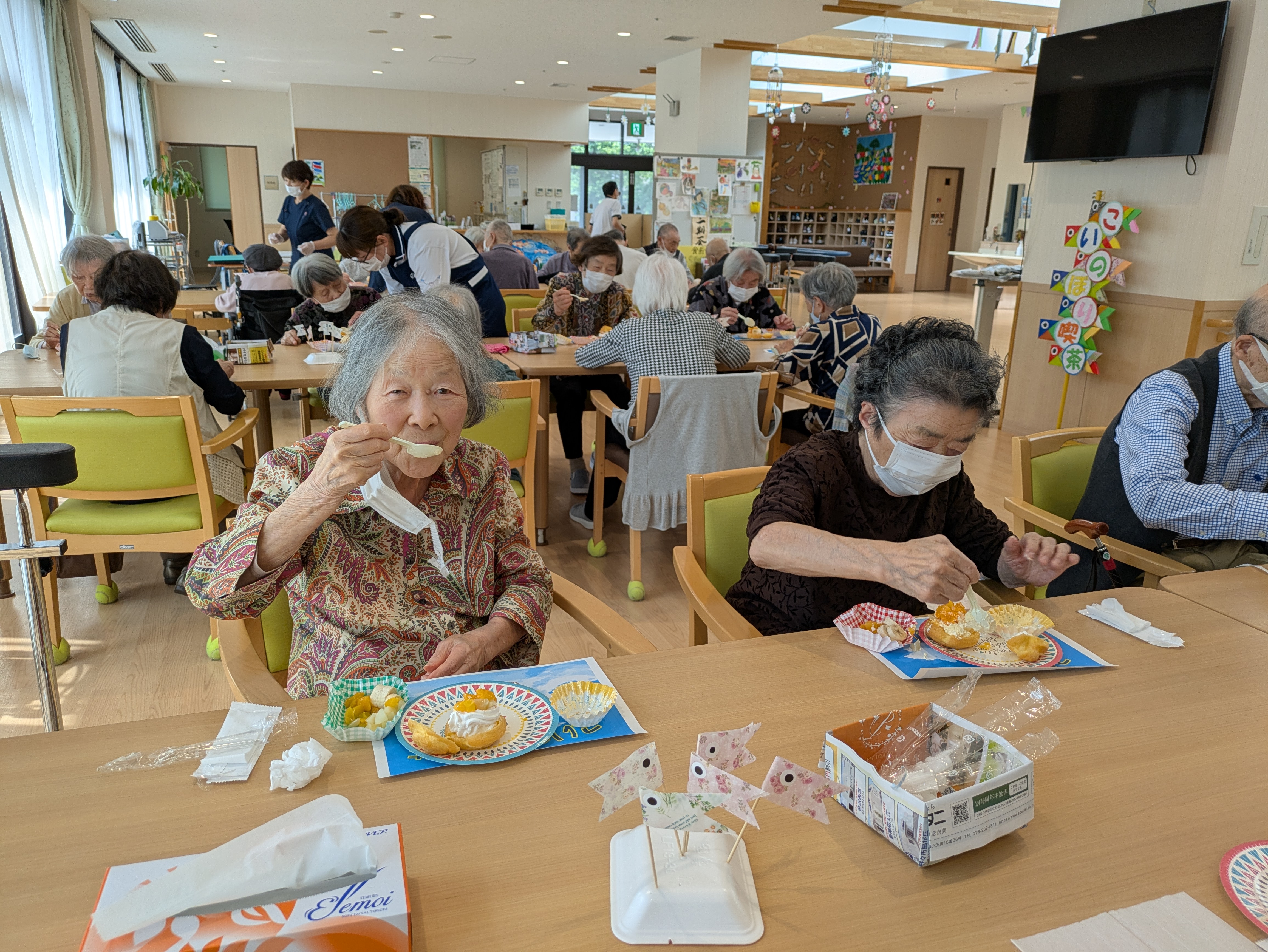 こいのぼり喫茶🎏 陽風園デイサービスセンター2025年6月2日 今年のこいのぼり喫茶は、「ふんわり雲のシュークリーム🎏」を美味しくいただきました! まずは、こいのぼりの飾りつくりから! シュー生地は、お隣のあけぼの作業所さんに焼いて頂き、午前中に届けていただきました! ふんわりとしたシュー生地に、たっぷりのクリームとフルーツを自分でデコレーション!! 最後に、雲に見立てたシュークリームにこいのぼりの旗を立てれば、オリジナルシュークリームの完成です😊💖 ボリューム満点!と思いきや「美味しい!!あと5個は食べられる💖」の声も飛び出た、こいのぼり喫茶でした🎏✨