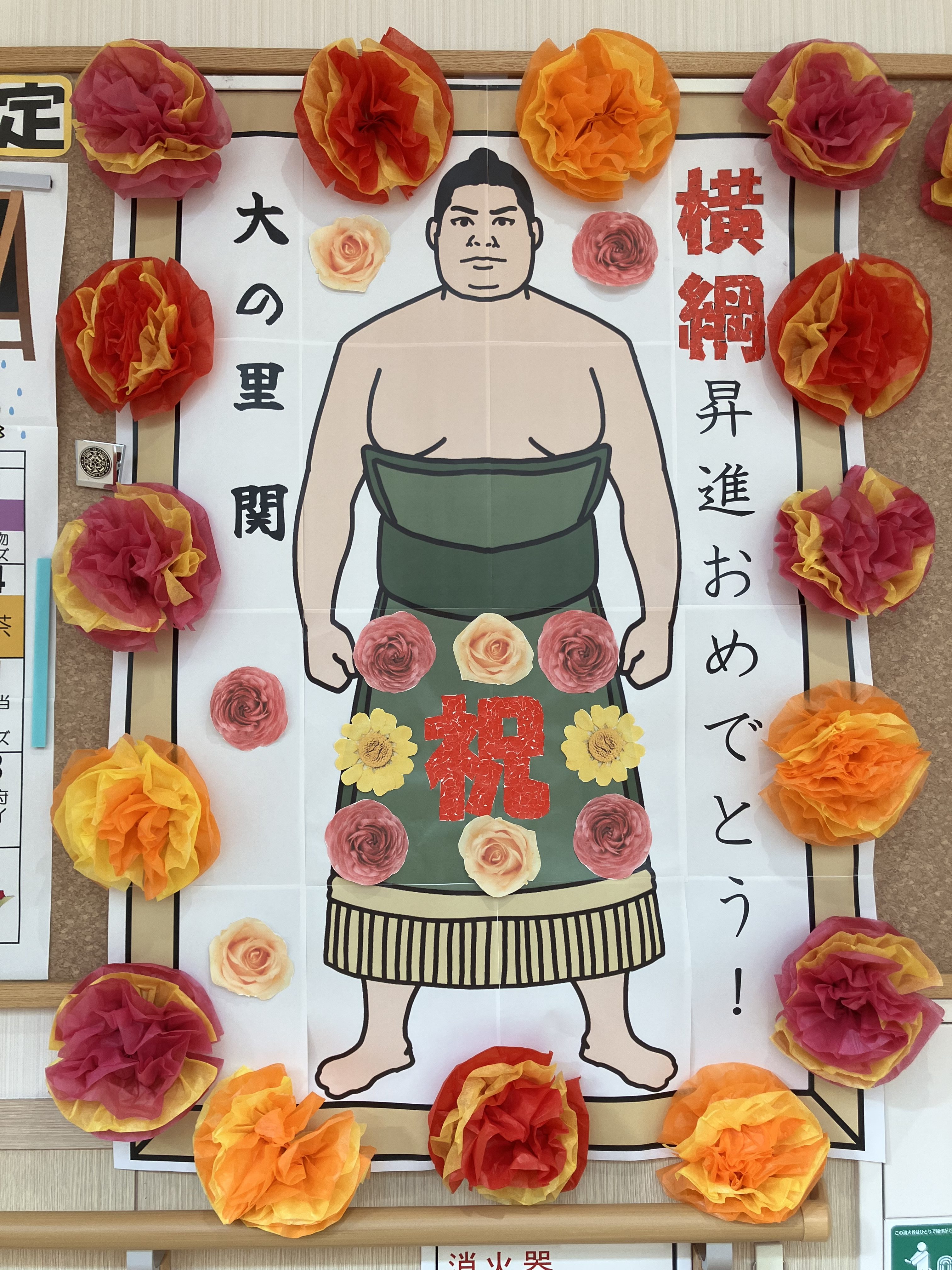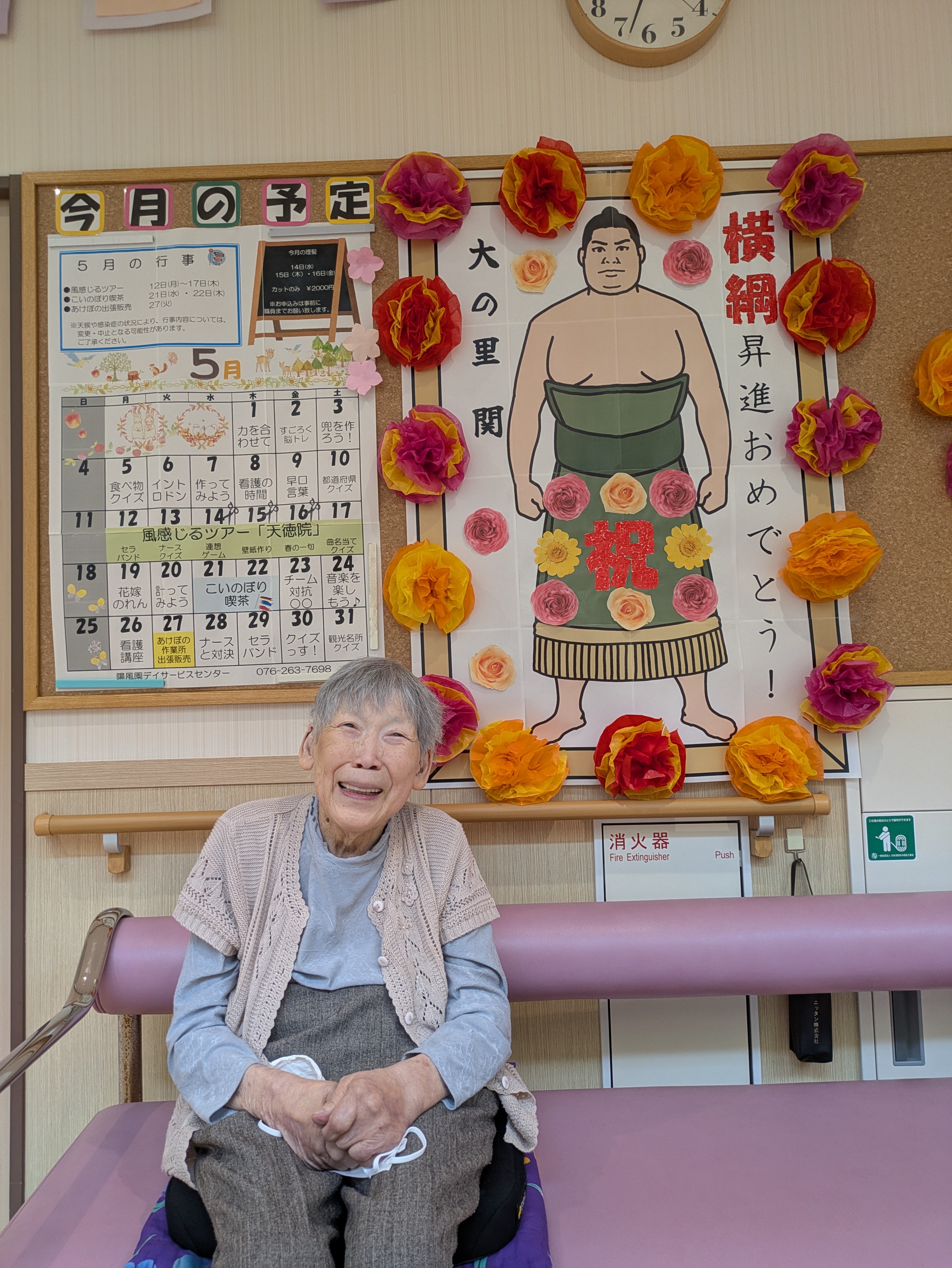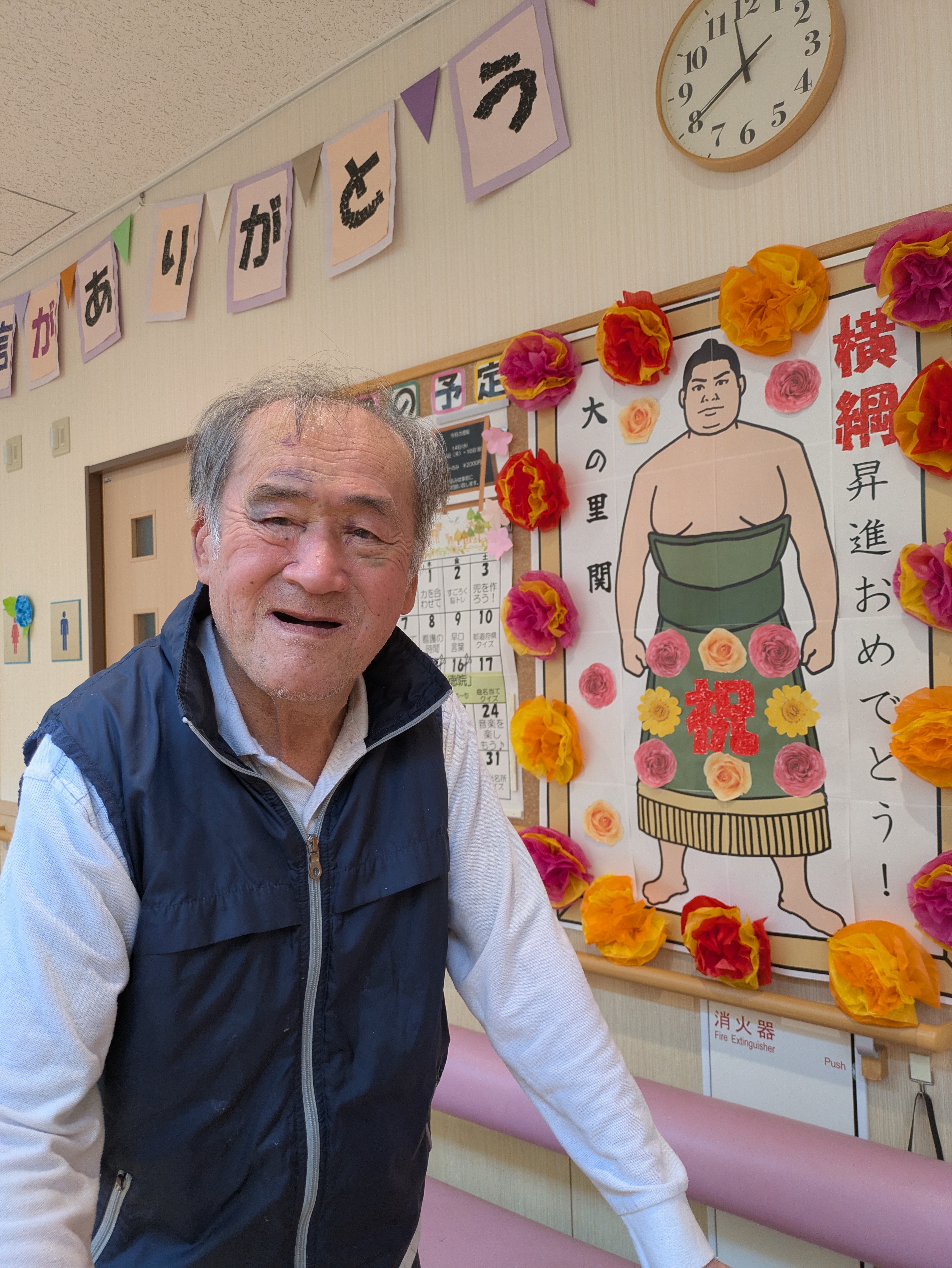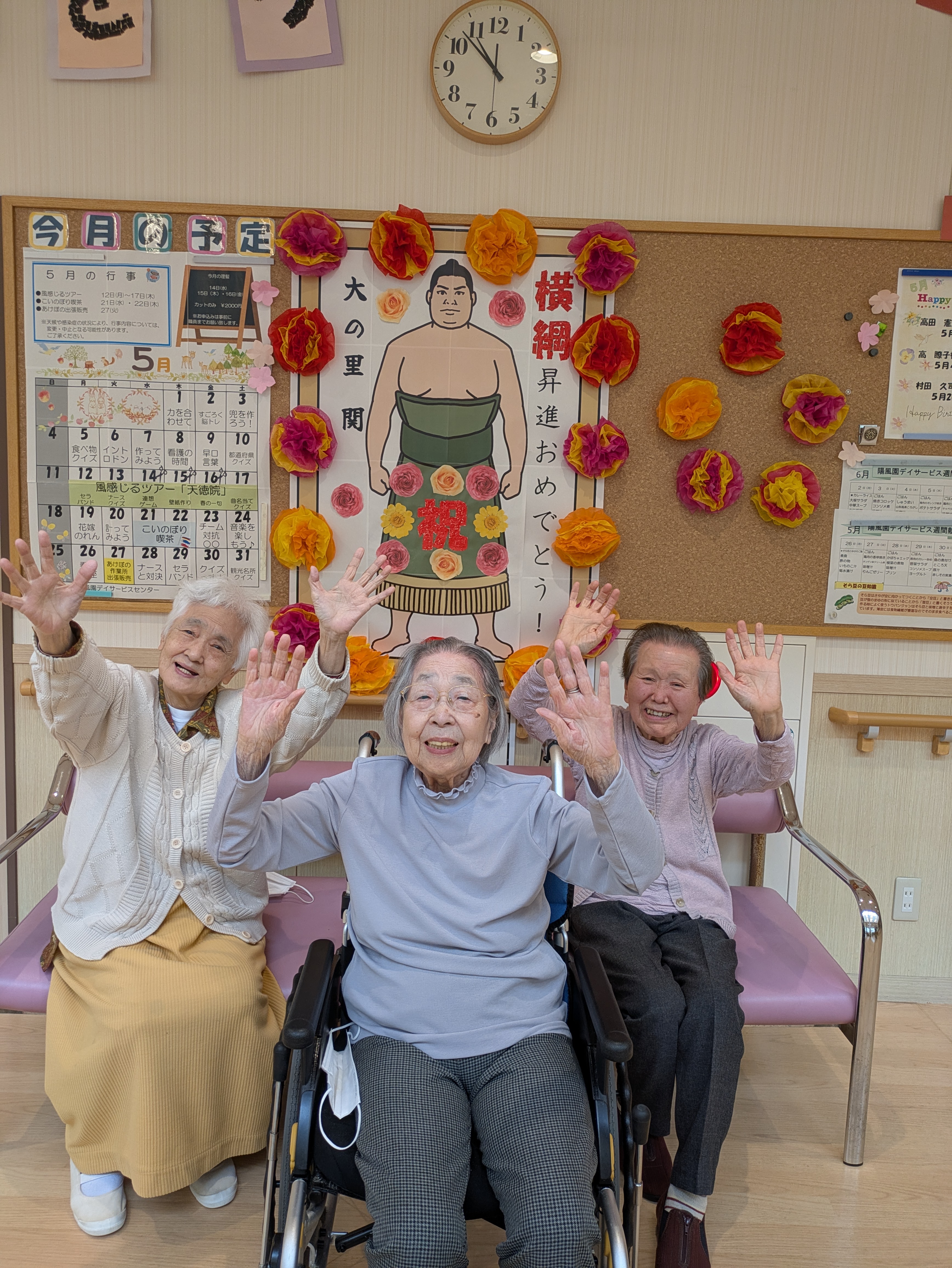 唯一無二の!! 陽風園デイサービスセンター2025年6月4日 久しぶりに、石川が元気になるビッグニュースがありましたね! 新横綱! 大の里の誕生です!! 陽風園デイサービスでも、一緒にお祝いをしたい♪という声があり、皆さんで唯一無二の化粧まわしを製作しました! これからも応援しています!がんばれ~!!