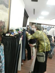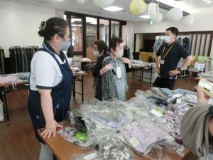 お洋服から靴下、下着、小物類まで、たくさんの商品が崎浦のホールにきれいに並べられて、アパレルショップの開店です♡ 先日、衣類販売会が行われました!