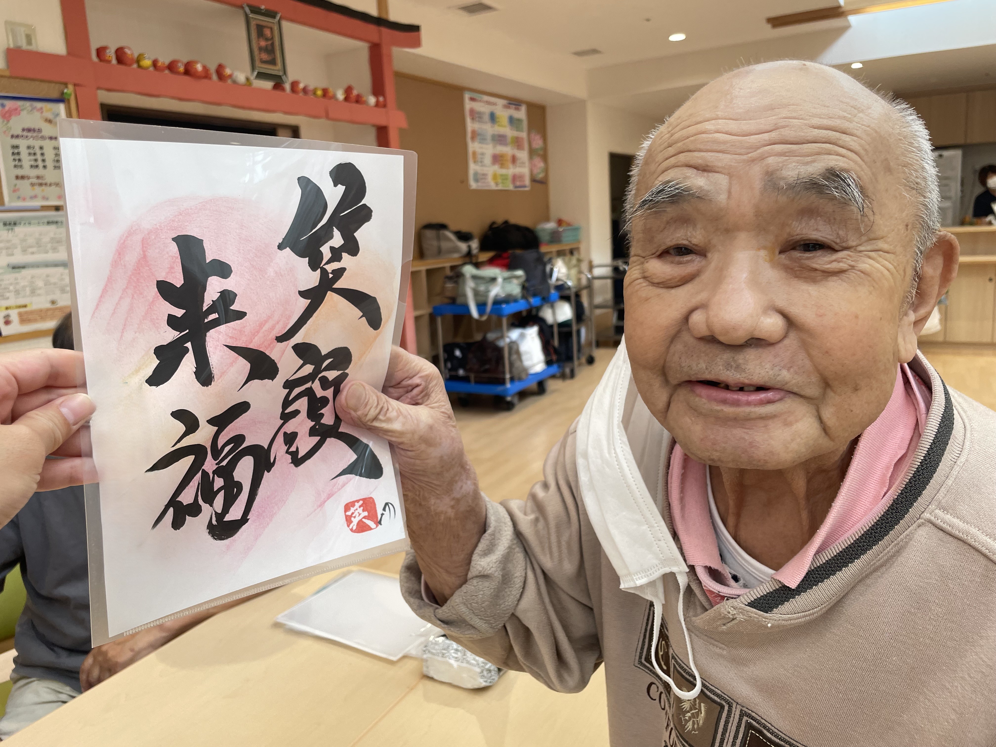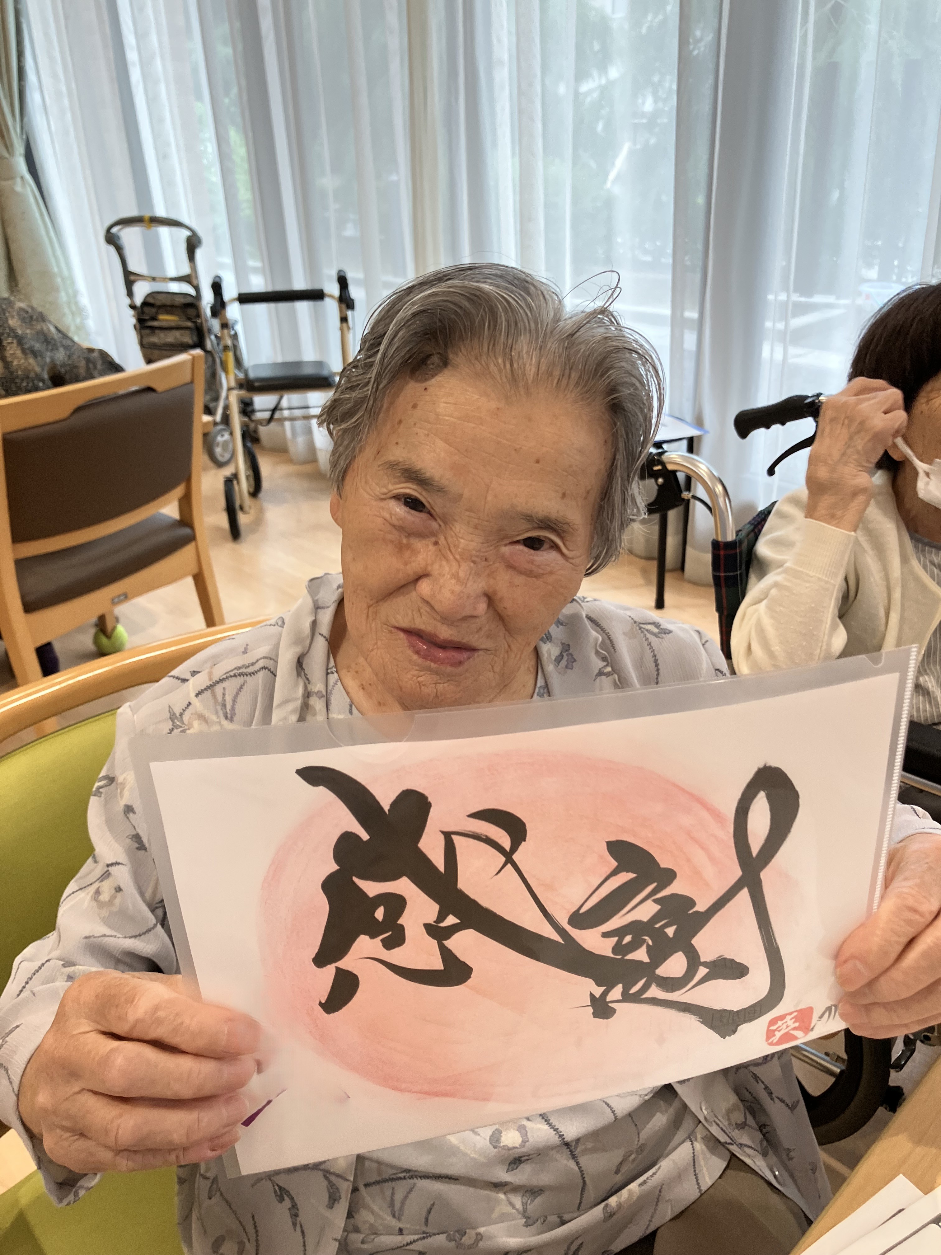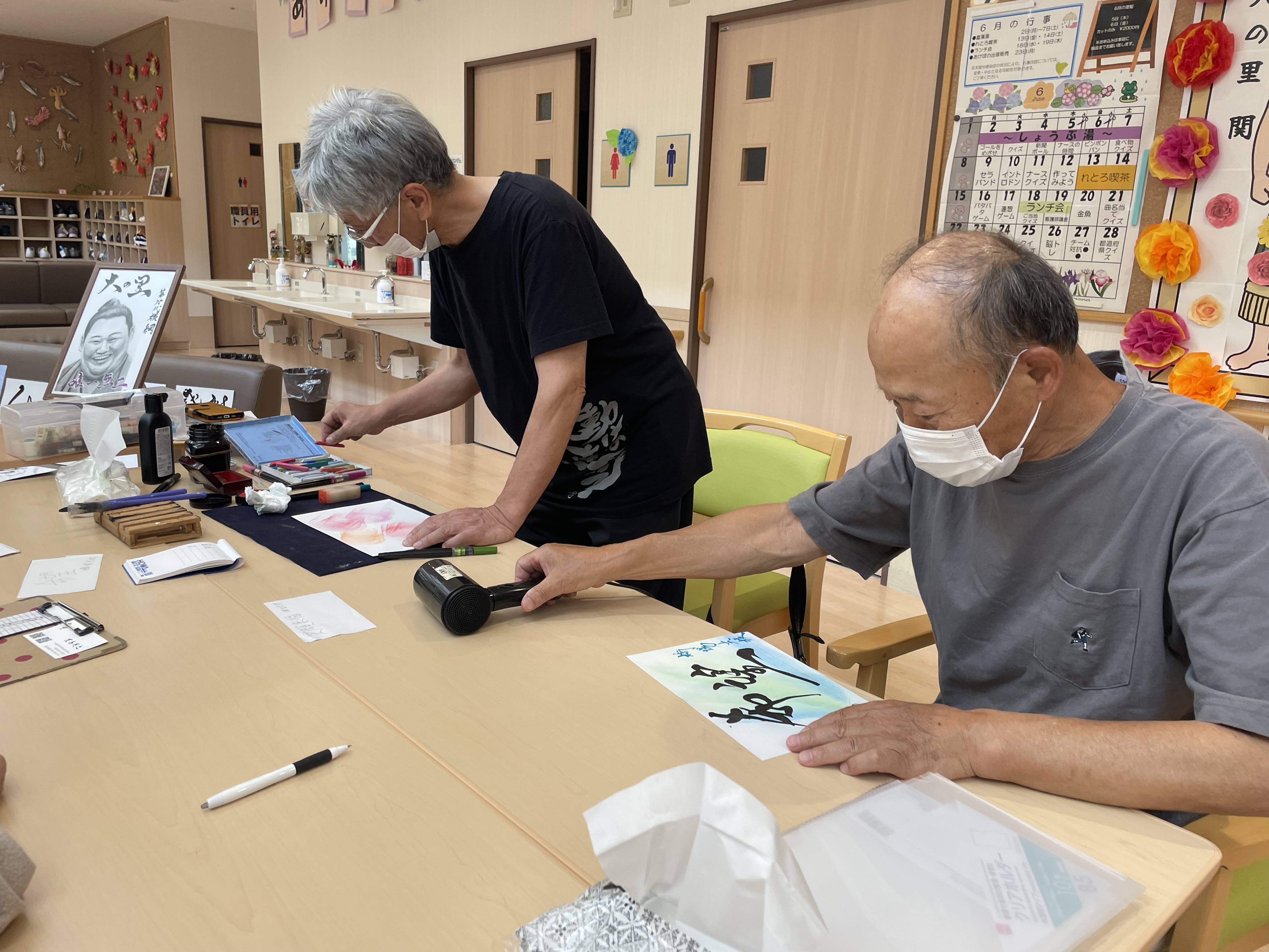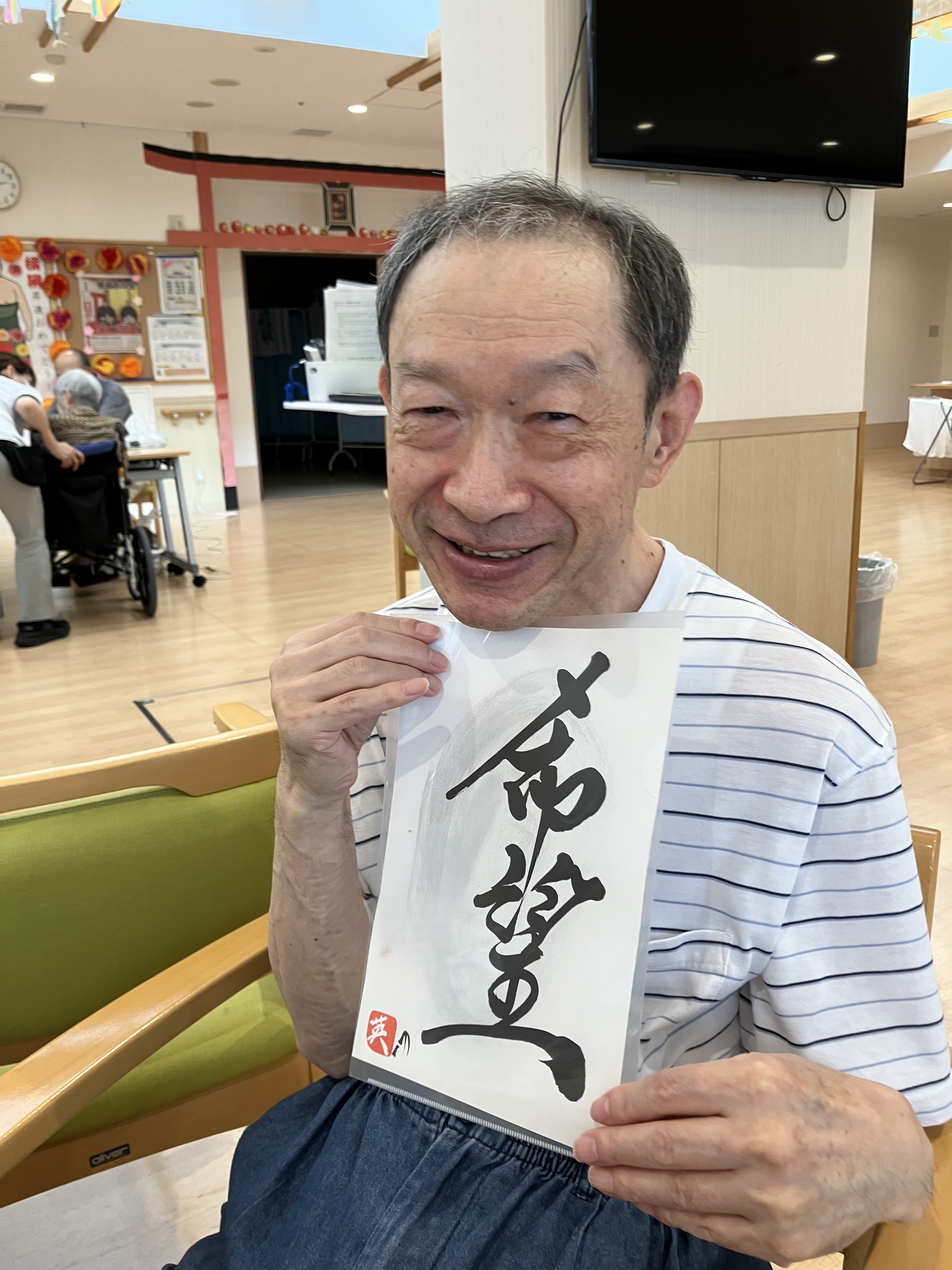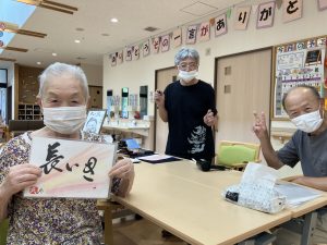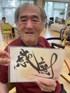 書道アート ボランティア来訪 陽風園デイサービスセンター2025年7月9日 ご縁があり、荒島英之さんに、ボランティアにお越しいただきました! 絵や書道のアート作品をいくつも製作されておられる荒島さんですが、今回は書道をご披露いただきました。 ご利用者様から好きな言葉や文字のリクエストをうかがい、その方を見たイメージで即興で書道で表現していただきましたが、力強い文字や、温かい文字、その方がまとった雰囲気を素敵に表現されており、皆さんとても喜ばれ、お顔がほころんでおられました😊💖 素敵な作品を、ありがとうございました!!