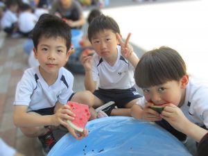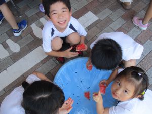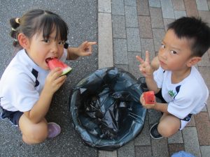 応援は大盛り上がり!みんなで割ったスイカはおいしかったようでおかわりをして食べる子もいました。