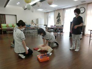 心肺蘇生法やAEDの使用方法を中心に、いざという時の対応方法について再確認し訓練を行いました。