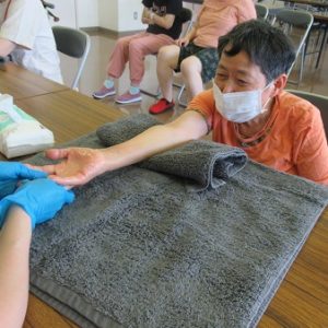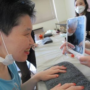 出張美容の「とってぃー」さんが来訪し、ハンド・フットマッサージとネイルケアのボランティアを実施していただきました。