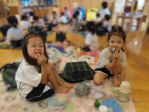 今日は2・3・4歳児クラスがおにぎりを持ってお散歩に行く、”おにぎり遠足”の予定だったのですがあいにくの雨でした。